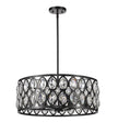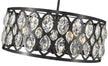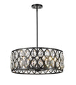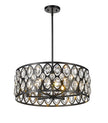 From the Dealey collection comes this elegant, round six-light chandelier. Featuring a striking ellipse-carved steel shade circling each of the six candelabras, this chandelier also features a dark matte black finish that accentuates the dangling, shimmering clear crystal pendants that disperse the light. Hang this alluring chandelier above a contemporary dining room table to lend a traditional touch.