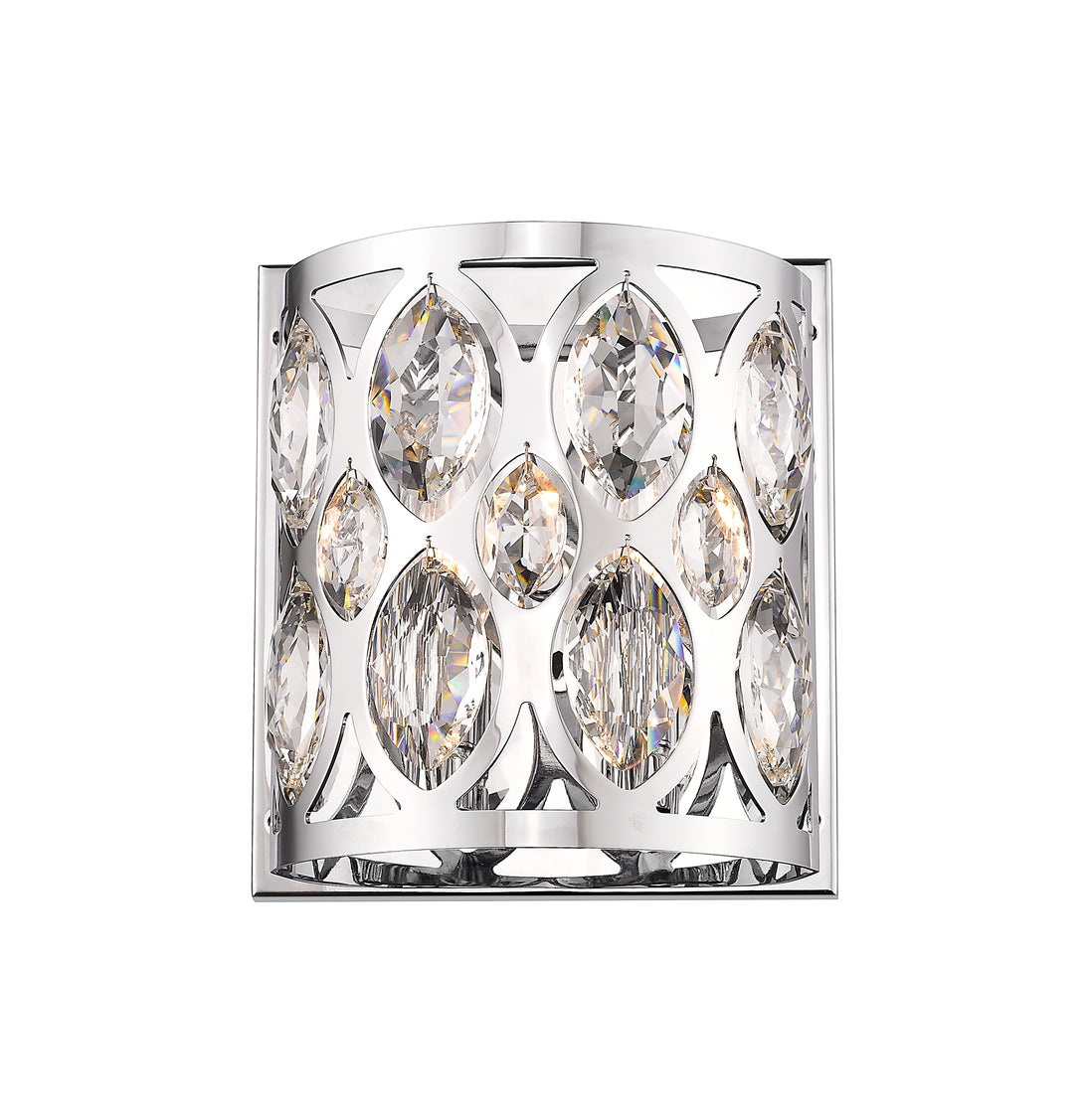 Subtle in size and rich in style, this chic wall sconce features an openwork pattern on a rounded silhouette. The shiny chrome frame is complete with reflective crystal accents.
