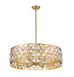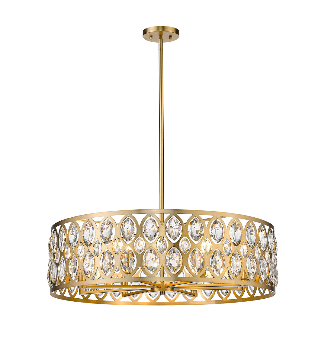 From the Dealey collection comes this elegant and wide eight-light chandelier. Featuring a round steel shade in a warm heirloom brass finish, this lighting piece exhibits a punched ellipse-style pattern, set with shimmering clear crystal pendants. This alluring and charming, contemporary chandelier lends a sophisticated flair to a dining room or living room.