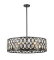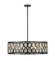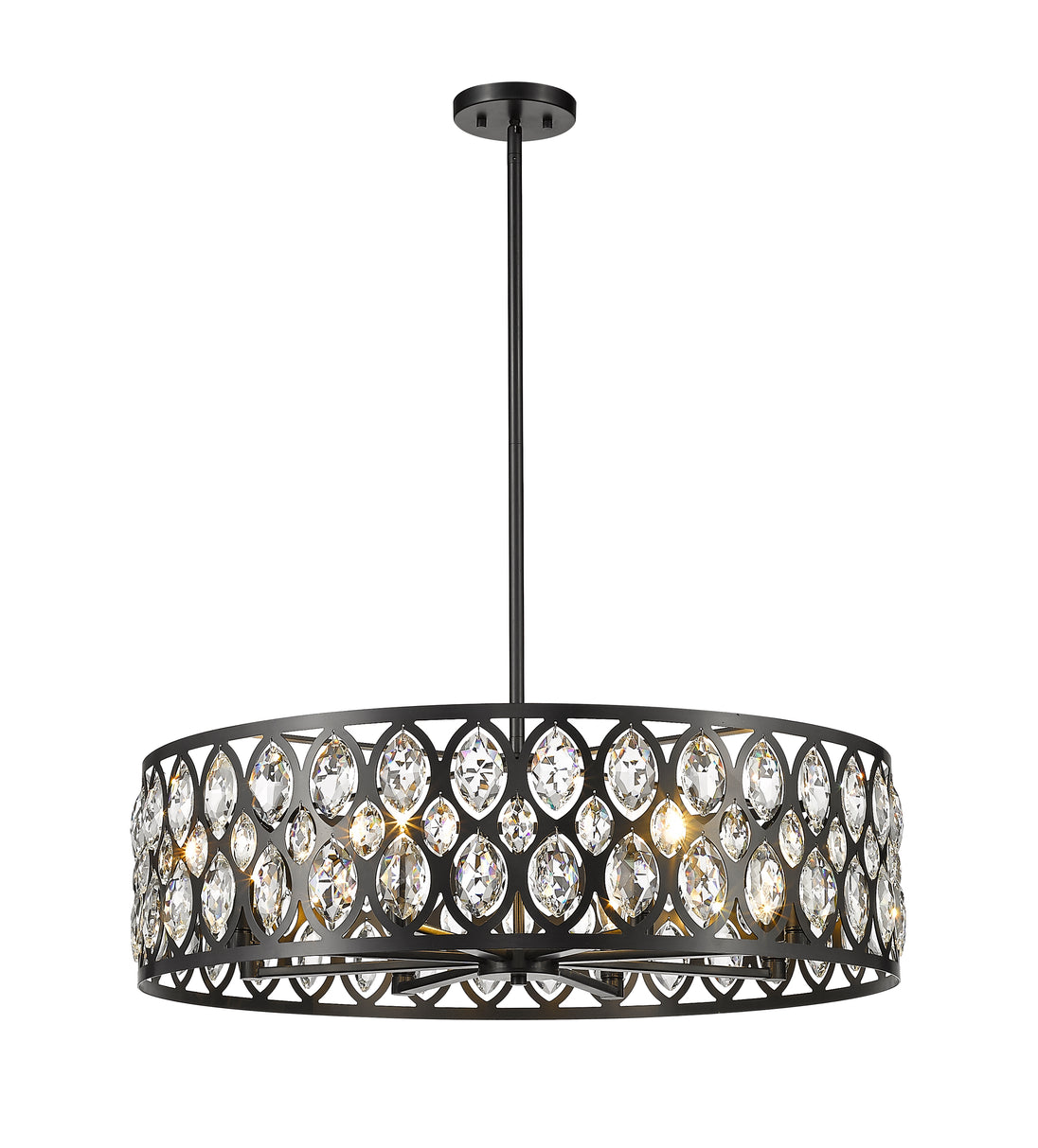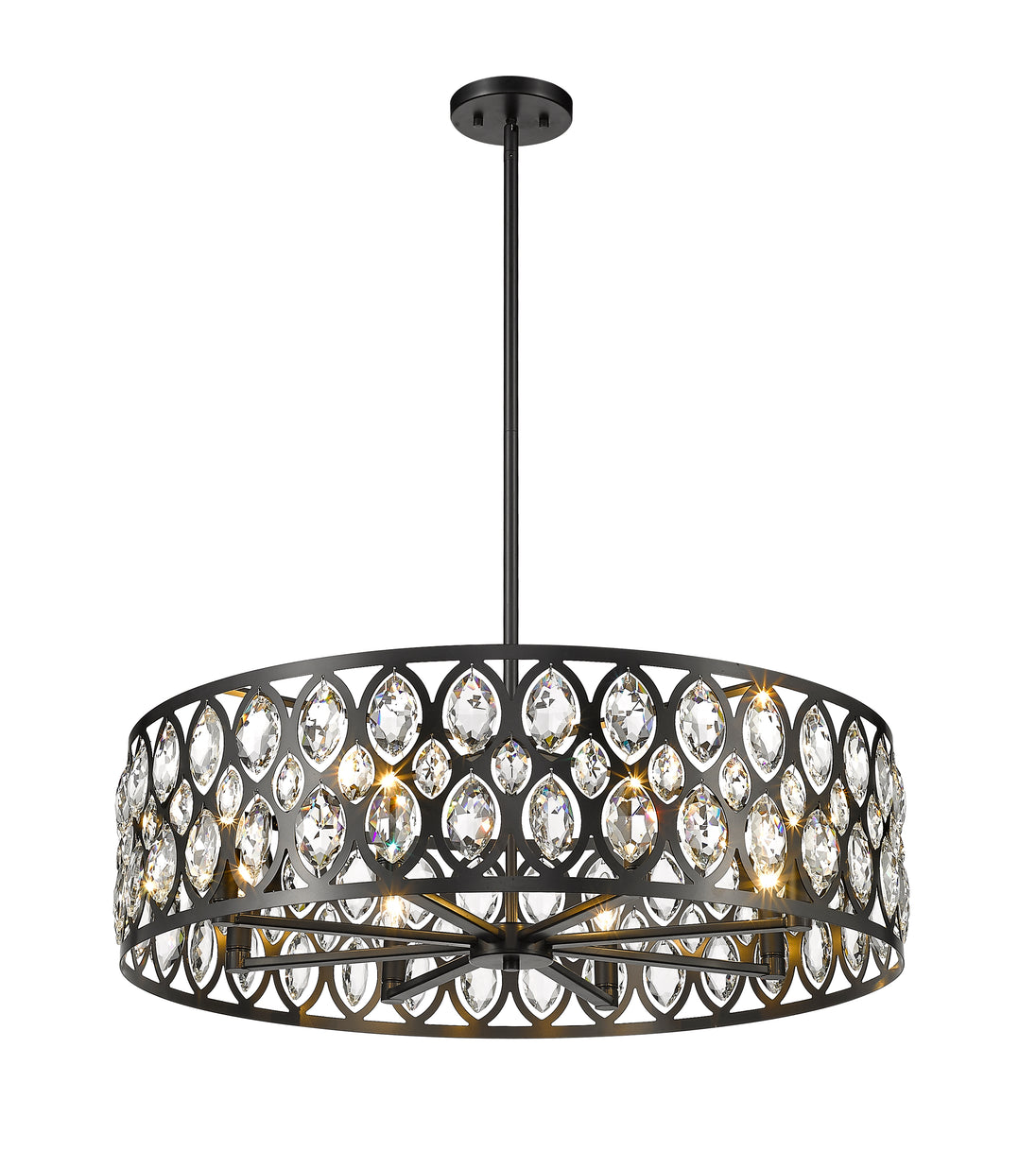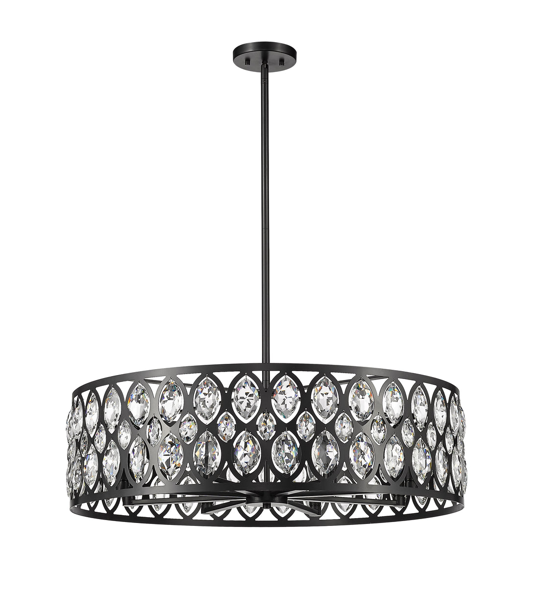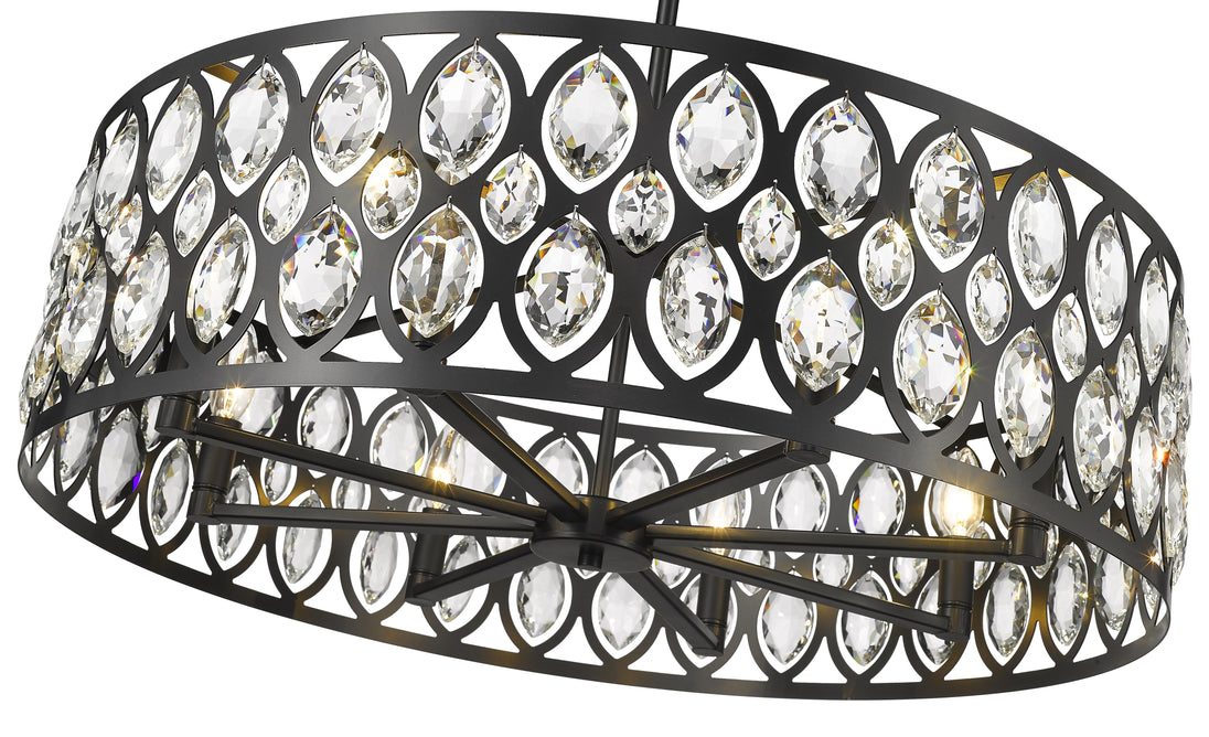 From the Dealey collection comes this elegant, wide eight-light chandelier. Featuring a dazzling ellipse-carved steel shade, which surrounds each of the eight candelabras, this chandelier lends a striking contrast with a blend of its dark matte black finish and glimmering clear crystal pendants. Cast a warm glow and illumination over a dining table or contemporary living room while adding a touch of glamour.