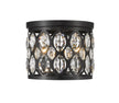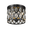 Exquisite and glamorous, this three-light contemporary flush mount ceiling light from the Dealey collection is the perfect addition to a Hollywood Regency style home foyer or hallway between rooms. Featuring a matte black steel shade, complete with striking ellipse-shaped cut outs with glimmering clear crystal pendants, this flush mount light lends a dramatic, contrasting look. With three candelabras set behind the crystals, this low profile fixture also creates a charming fractalized illumination along the walls and footpath.