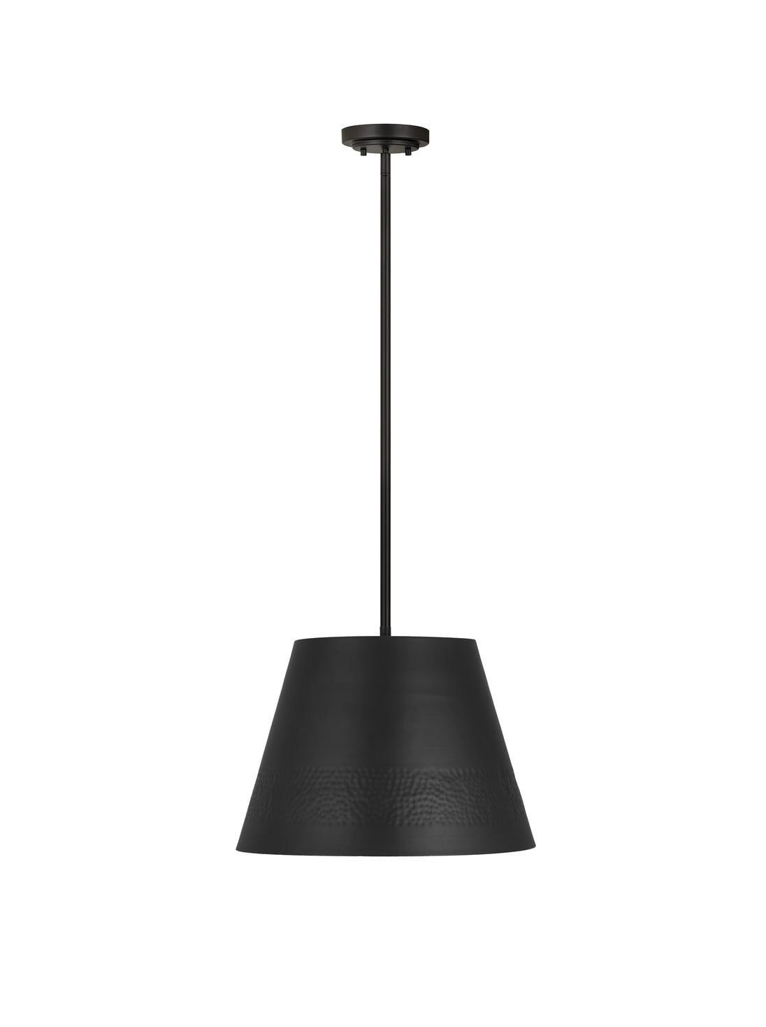 A texturized effect follows the hammered belt detail that changes up the look of this one-light pendant, creating a sleek artistic effect. Crafted of bold matte black finish iron, this pendant from the Maddox collection illuminates a custom casual kitchen, dining area, or living space with a classic industrial style. A matching down rod and canopy maintain design consistency.