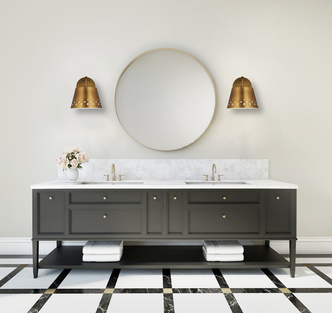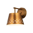 A striking look of sophistication sneaks in whimsical charm when this one-light wall sconce brings festive vibes to any casual space. This sconce from the Katie collection delivers an upbeat flavor with its warm rubbed brass finish iron construction and novel circular cutouts that add character as they let light shine through.