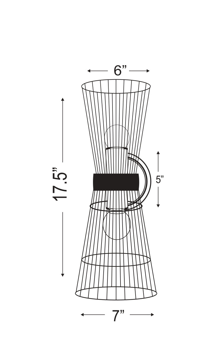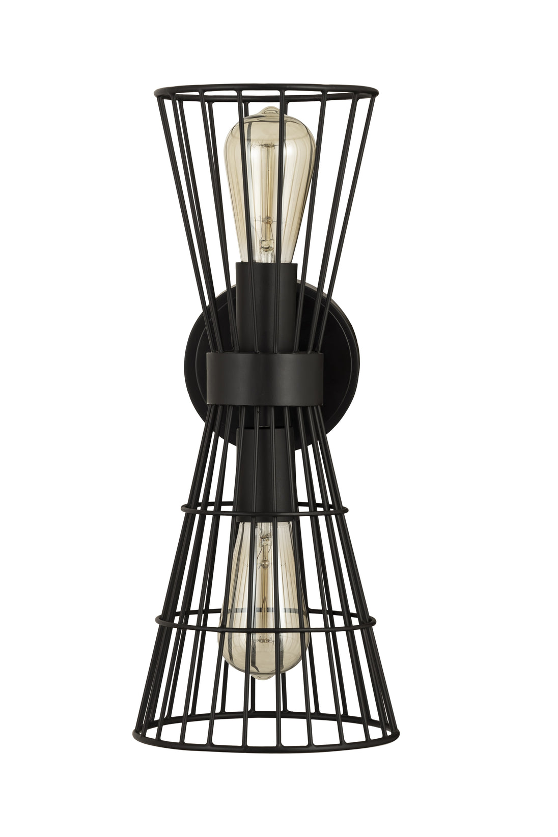 A cage-like design offers a hint of industrial inspiration to this energizing two-light wall sconce, a superb choice for a custom casual space. Light up a hallway, bathroom, or bedroom with this sconce offering geometric elegance in a concave silhouette and thin wires made of matte black finish iron. Adding separately purchased vintage style bulbs changes up its motif to reflect versatility.