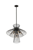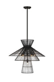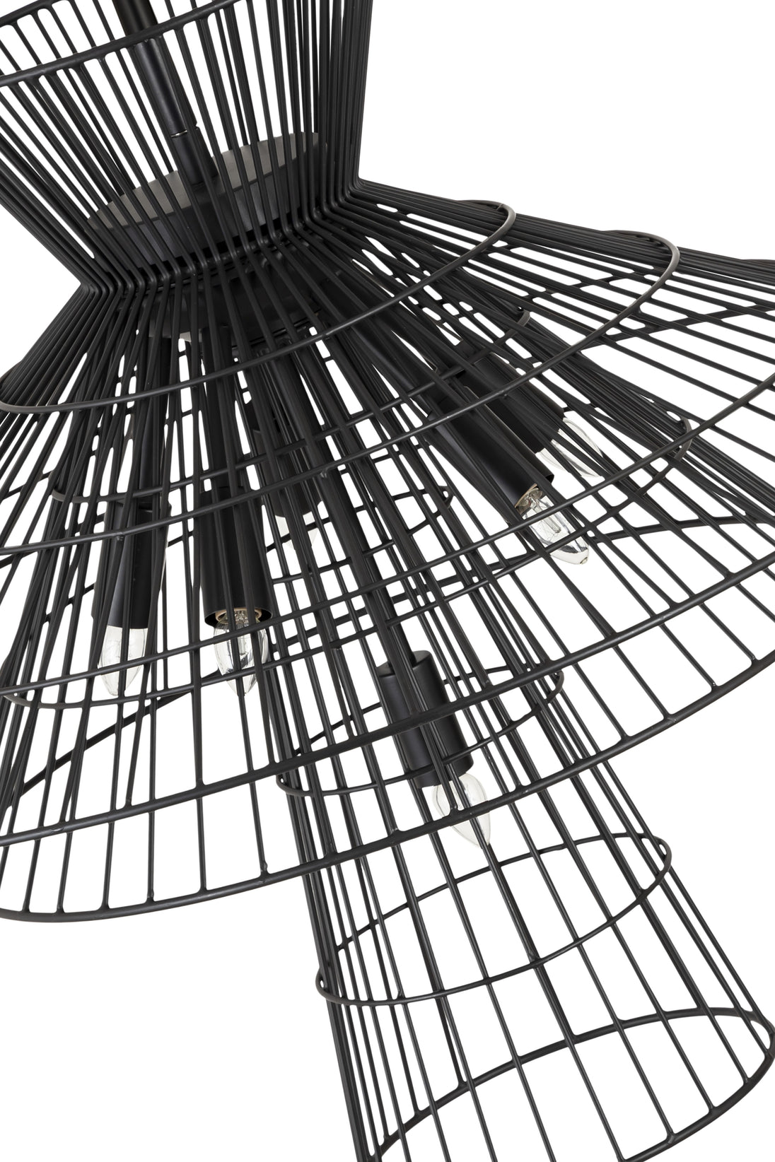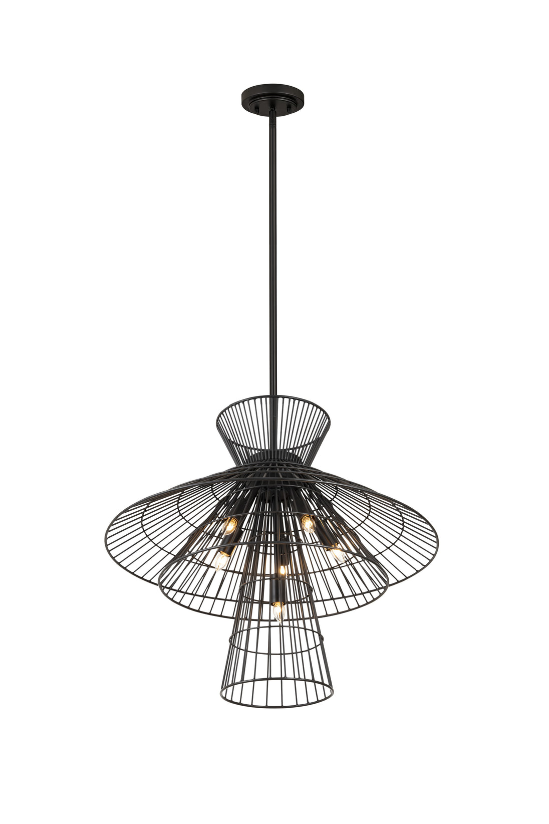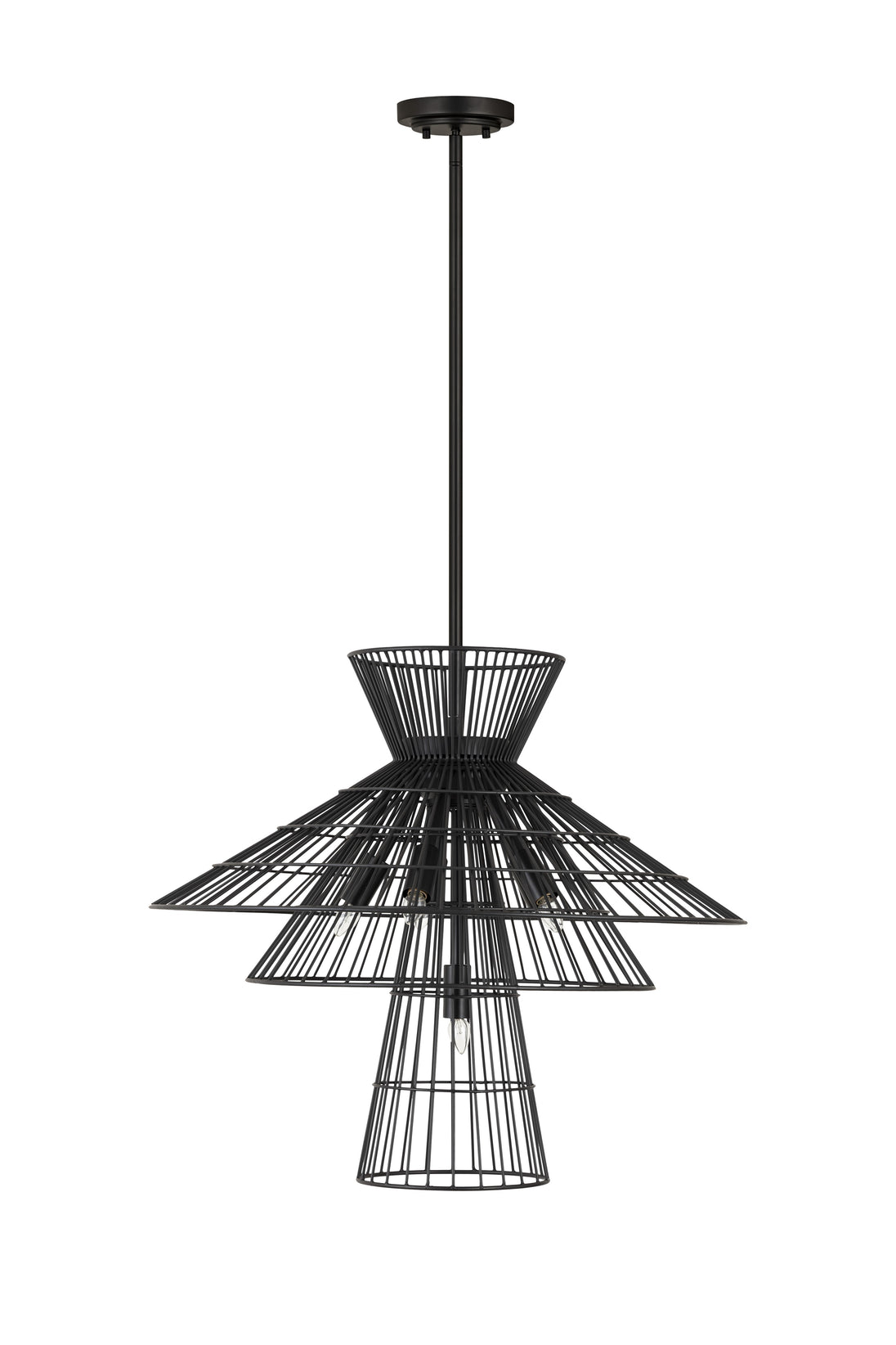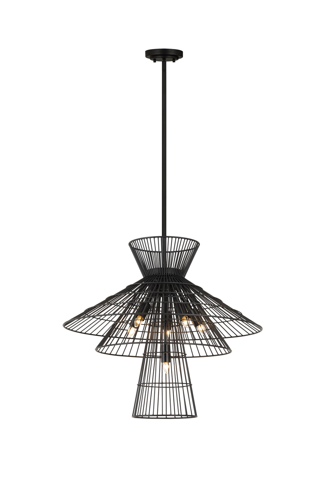 Offer up an energetic look while choosing lighting in a custom space, adding the Alito six-light pendant to steal the show. Bold matte black finish iron crafts a tiered geometric arrangement of wired pieces and matching down rod and canopy. This striking fixture reflects a blend of industrial and modern styling.