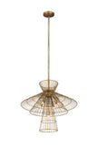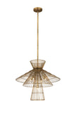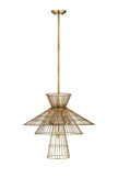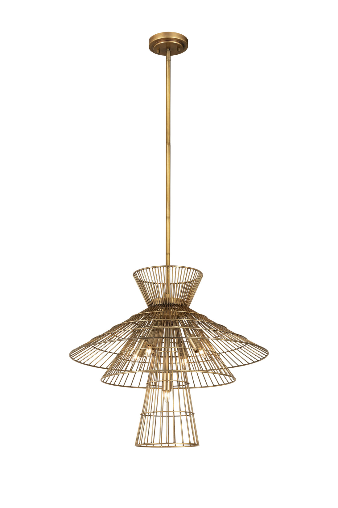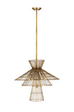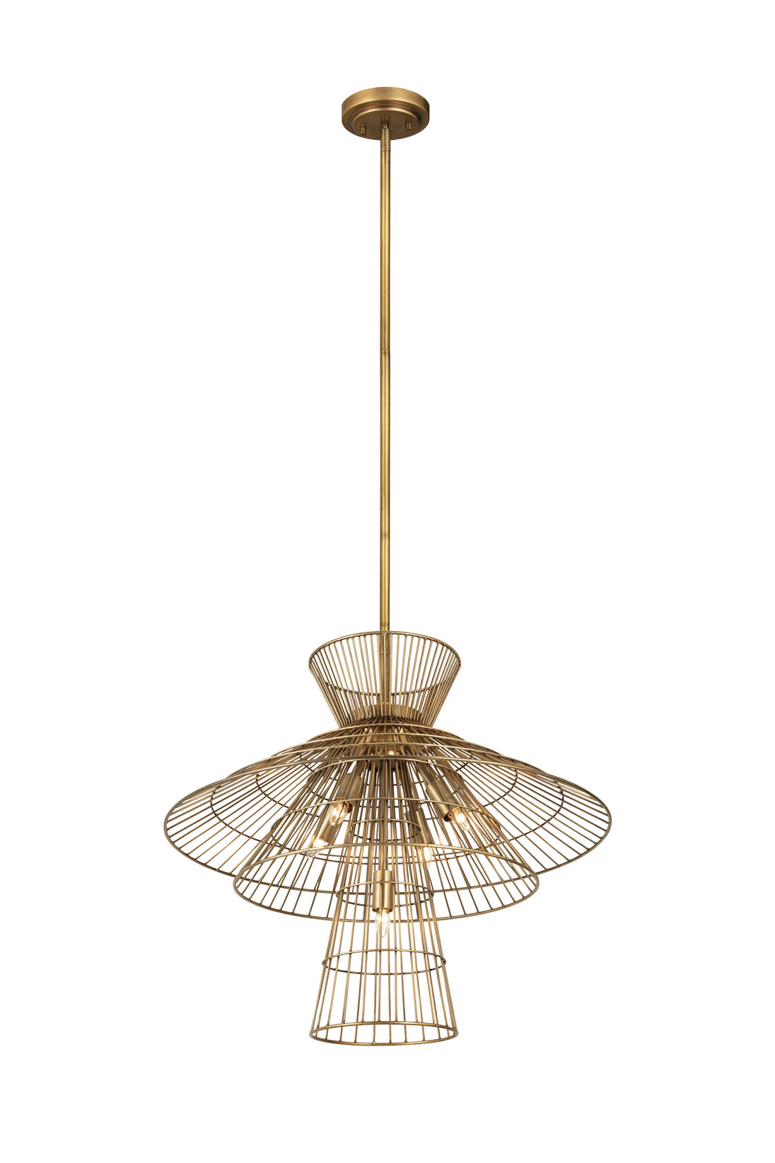 Offer up an energetic look while choosing lighting in a custom space, adding the Alito six-light pendant to steal the show. Warm rubbed brass finish iron crafts a tiered geometric arrangement of wired pieces and matching down rod and canopy. This striking fixture reflects a blend of industrial and modern styling.