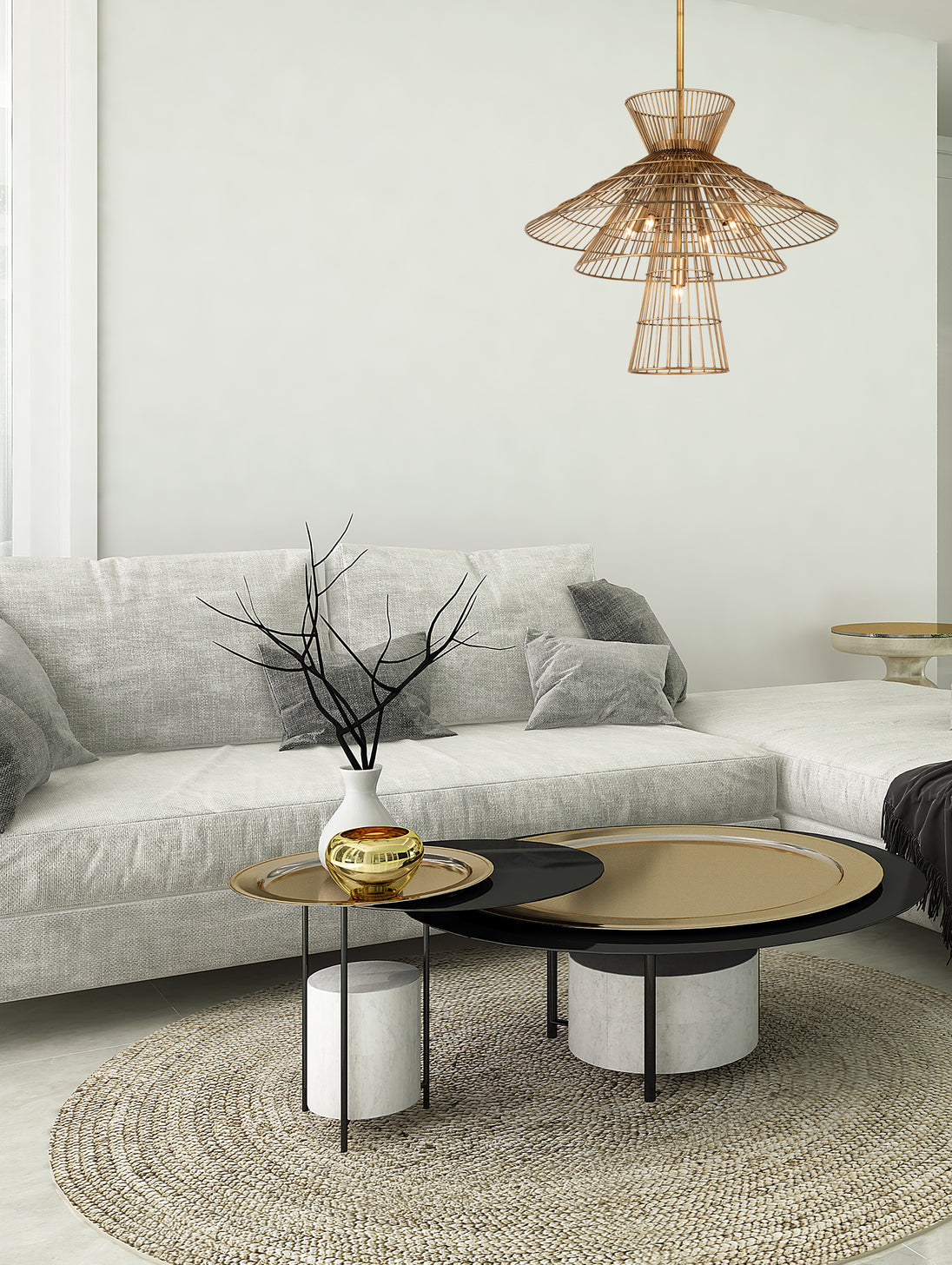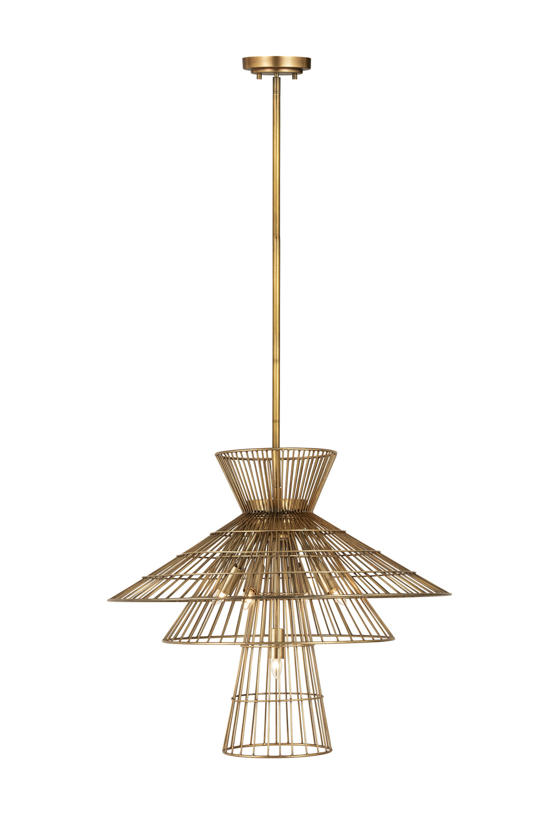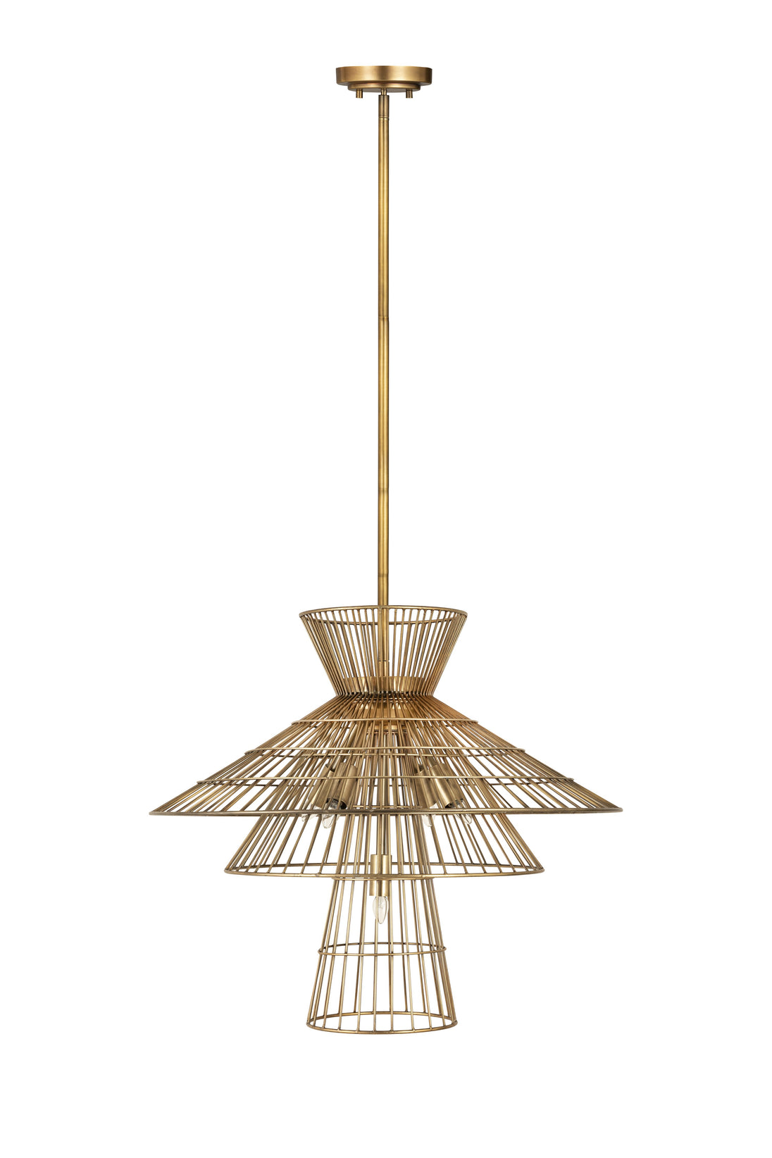 Angular geometric shapes created by the stacked conical steel cages create a visual statement for any room. Available in a choice of finishes such as Matte Black, Polished Nickel, and Rubbed Brass, this collection is both contemporary and warm. Complete this look with vintage-inspired light bulbs to capture the full effect.
