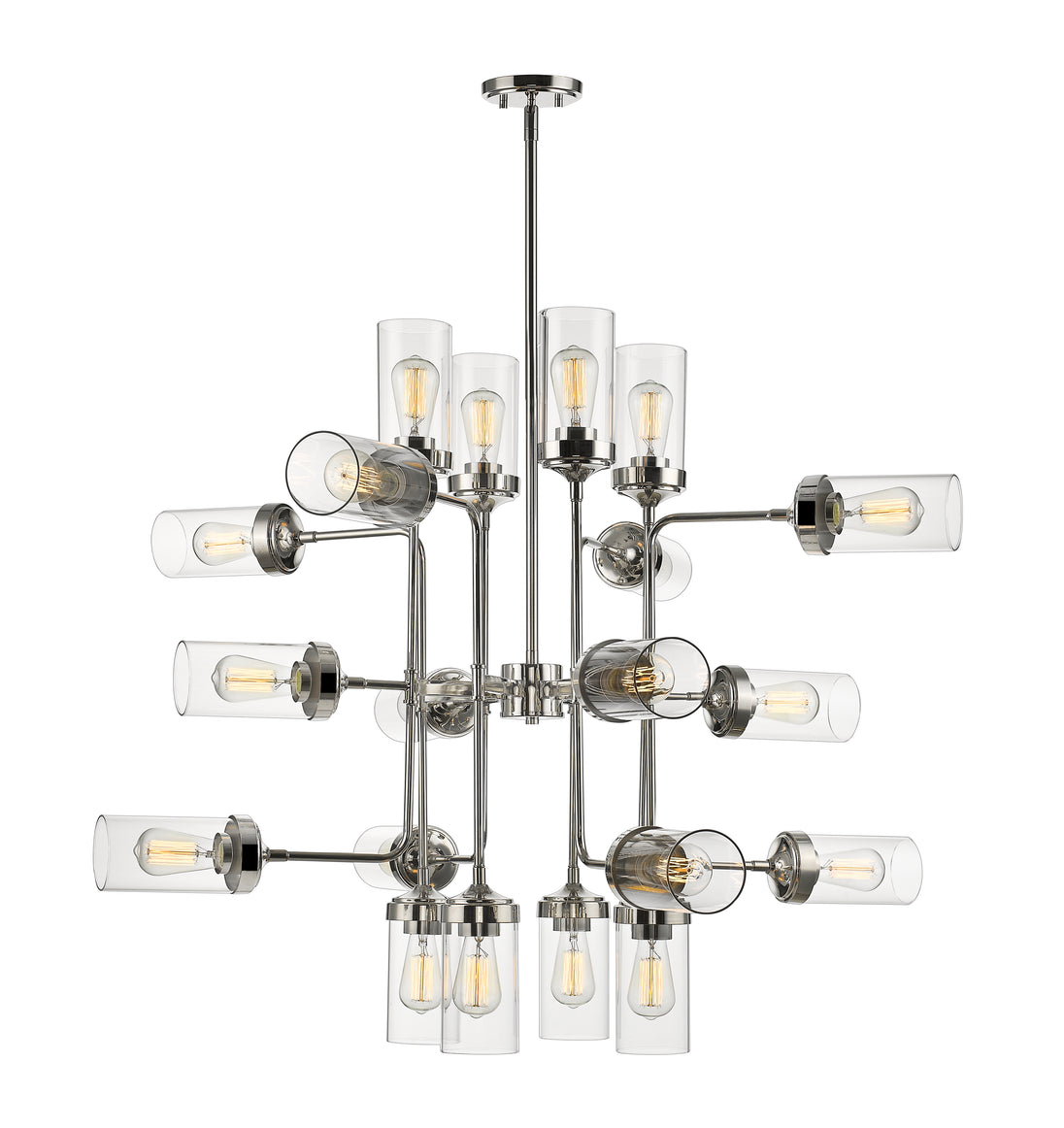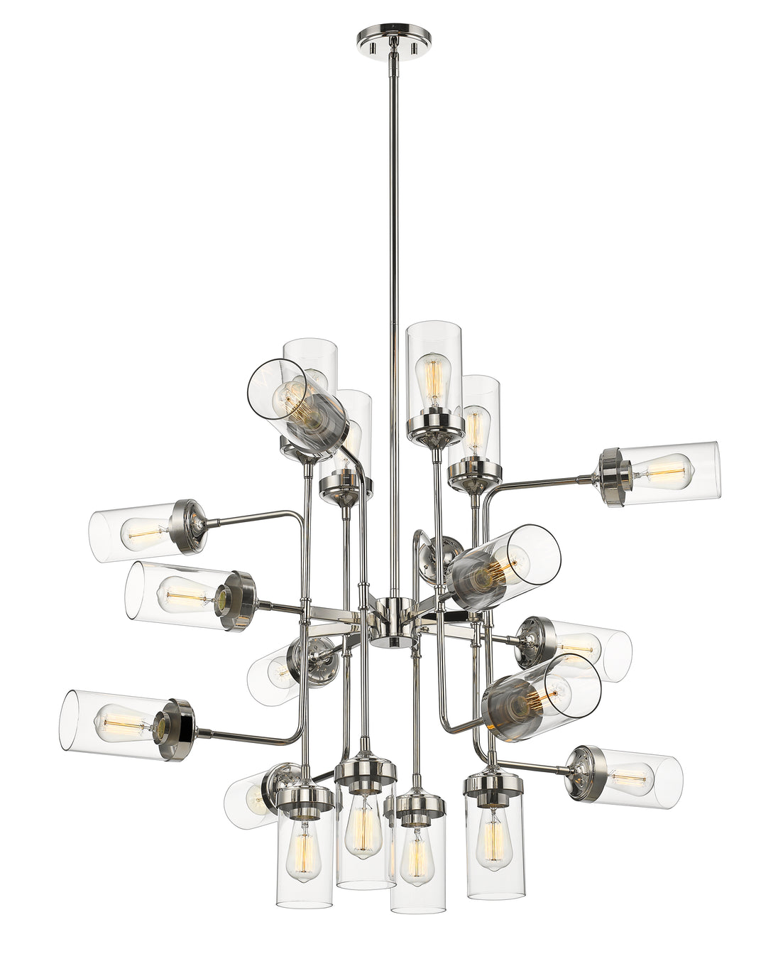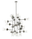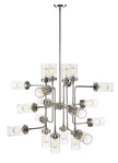 Turn a transitional living space into an industrial décor museum with this fashionable 20-light pendant. Hardware-inspired shapes in polished nickel finish steel form a symmetrical puzzle with clear glass shades offering a finishing touch.