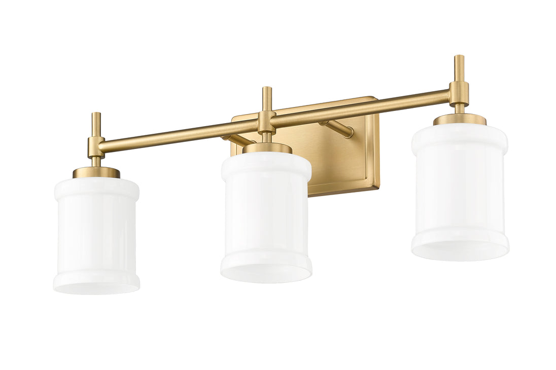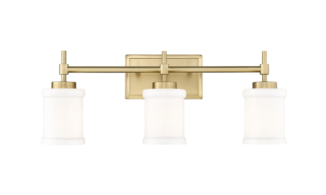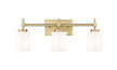 Bring rich allure to your master or guest bath with a modern three-light vanity fixture. In modern gold, it adds visual warmth and interest, relying on textural elements in both its wall plate and decorative arms. Three glossy white glass shades deliver impeccable illumination and offer cuffed details and the top and bottom, further enhancing a textured, dimensional presentation.