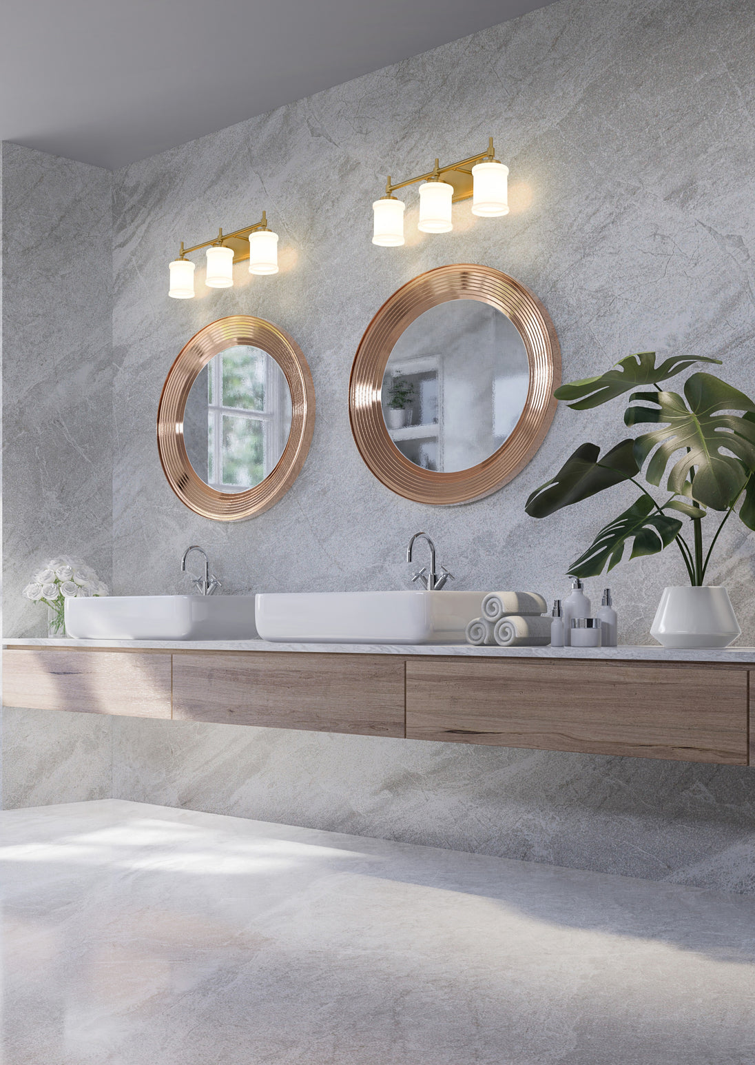 Elegant cuffs on the top and bottom of the glass shades elevate the simple lines of the Cadoc vanity series. Available in a variety of light configurations to accommodate any vanity size, Cadoc is offered in a choice of Brushed Nickel, Matte Black, Chrome, and Modern Gold finishes.