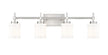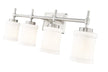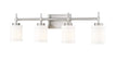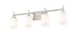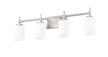 Span a generous sink or counter with the fresh, contemporary style of a modern four-light vanity fixture. Sleekly designed, it showcases clean lines and elegant cuff details that add the perfect dose of character and dimensionality. Glossy white opal glass shades pair with a crisp brushed nickel finish to create a fresh, refined look and feel, in any bathroom.