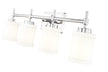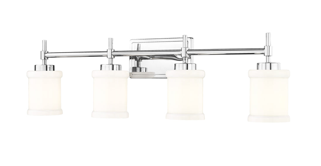 A shiny chrome finish plays up the textural elements of a modern four-light vanity fixture. Perfect for a spacious counter, it boasts a long horizontal arm with decorative posts, each hosting a cuffed cylinder of glossy white glass to deliver exceptional illumination.