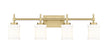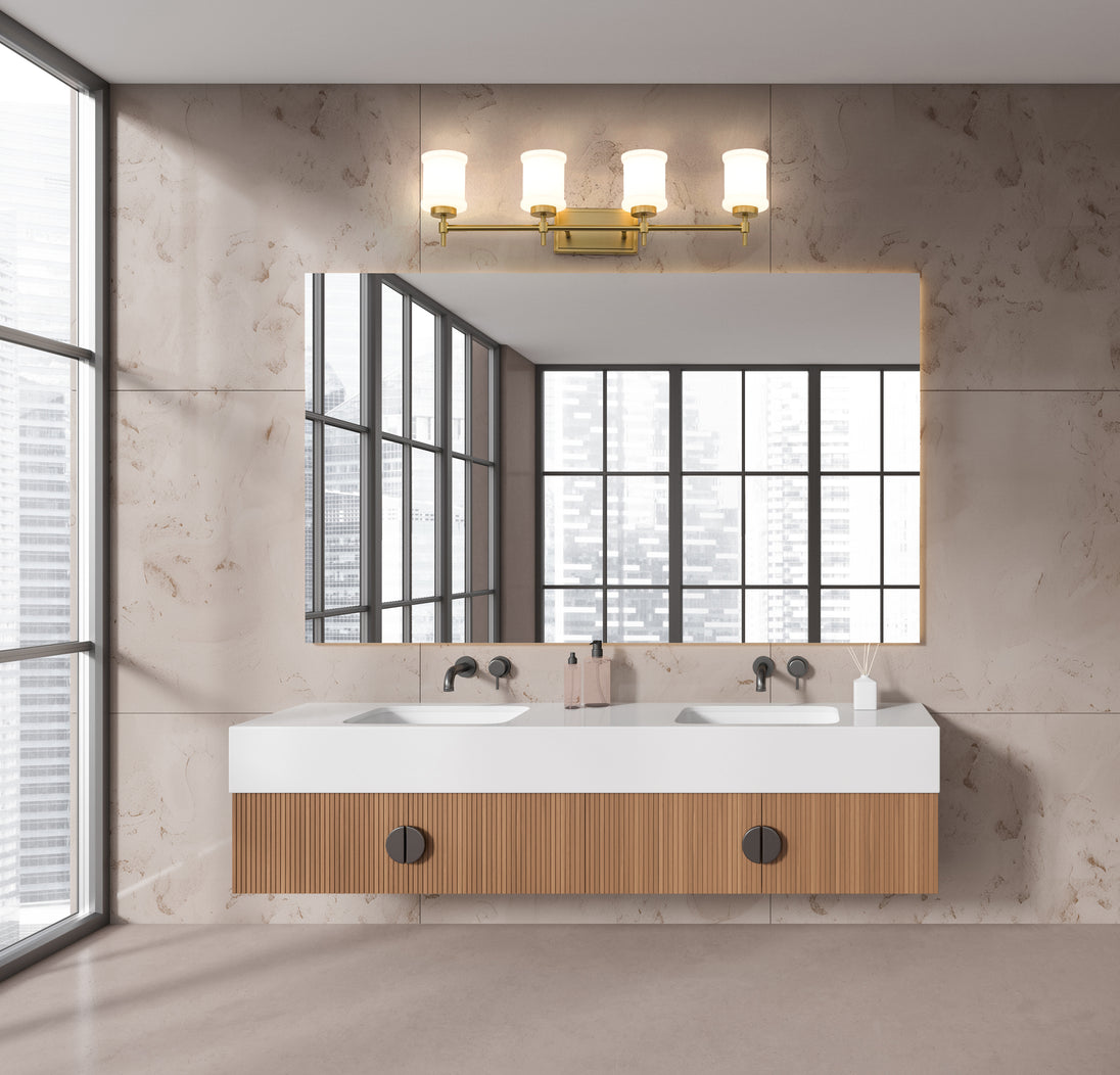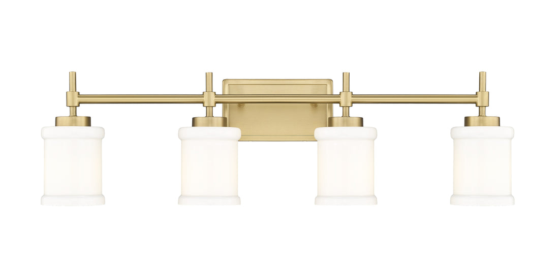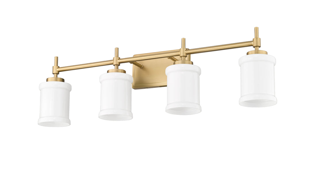 Infuse a sense of warmth and sophistication with a modern four-light vanity fixture. In a modern gold finish that adds glowing allure, the light boasts a trimmed wall plate and decorative arms, offering impeccable dimension and depth over your counter. Glossy white glass cylinders shade each light, enhanced with cuffs that add a perfect dose of dimensionality.