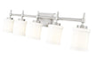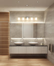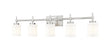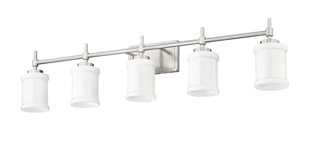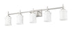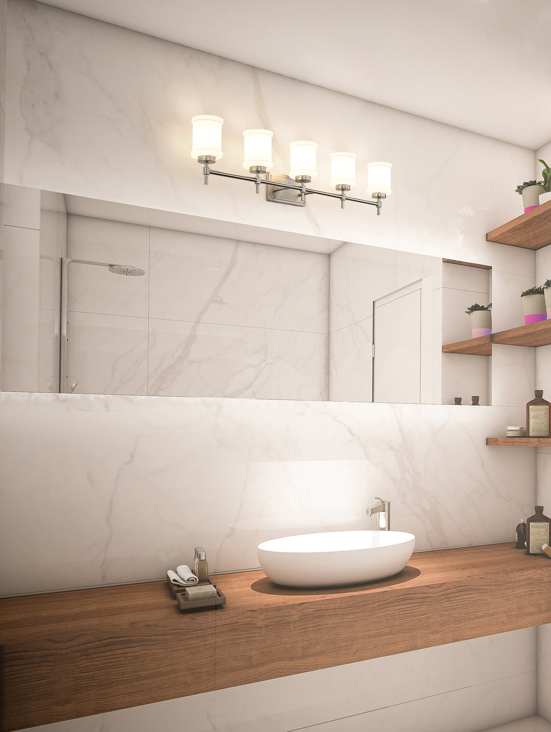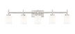 Put the finishing touches on a master bath with a modern five-light vanity fixture. Embellished with cuff details at the top and bottom, its five glossy white opal glass shades deliver stylish flair and beautiful, diffused illumination. This large fixture is ideal for a large vanity counter and includes a fresh brushed nickel finish.