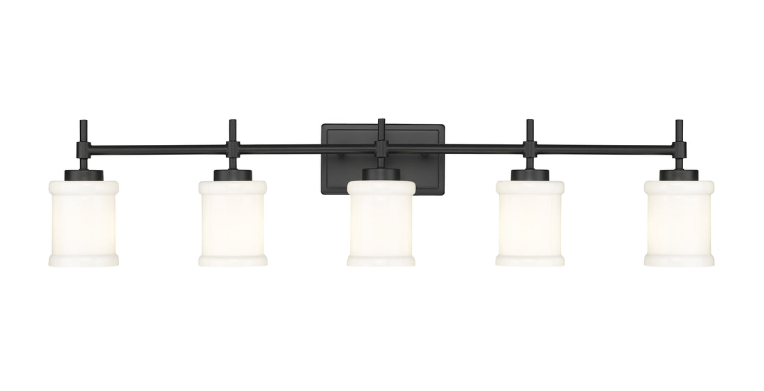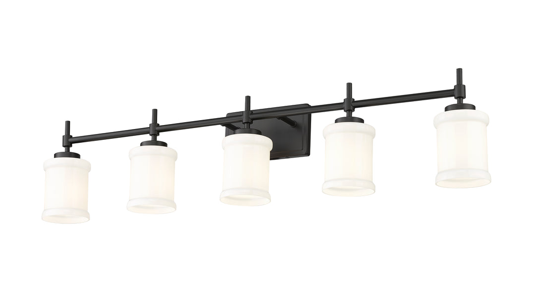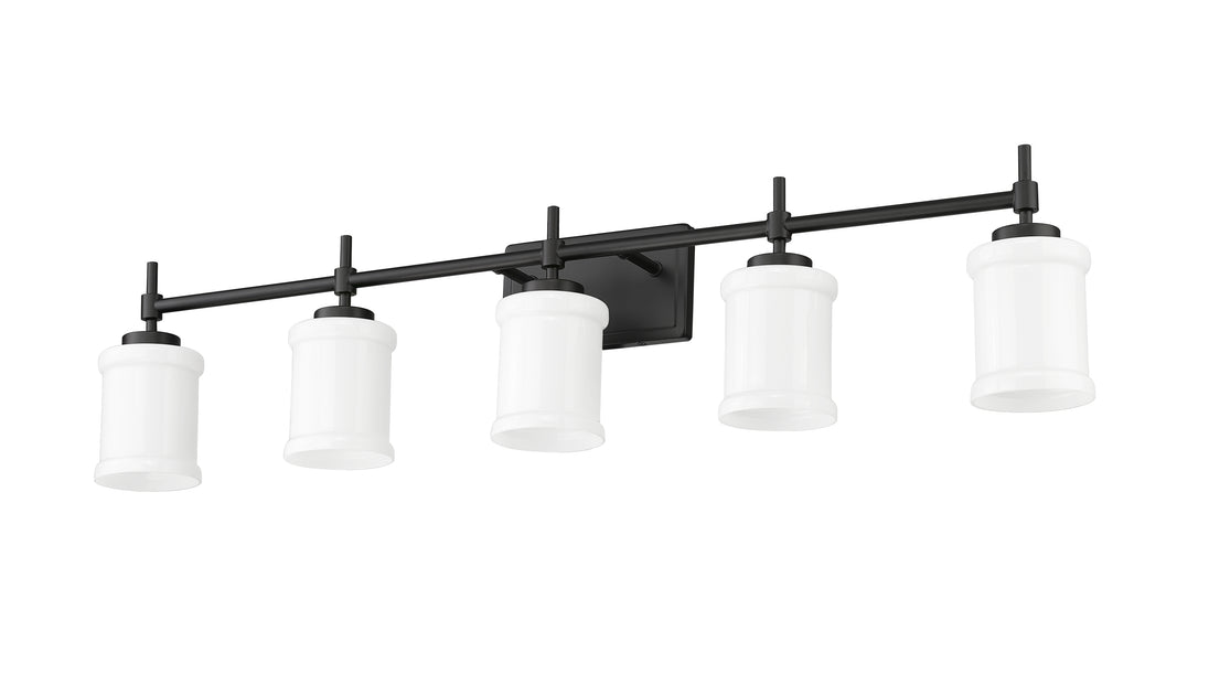 Glossy white glass shades pair with a contrasting matte black finish in a modern five-light vanity fixture. Brimming with understated textural details, the fixture features a trimmed wall plate and decorative arms, while glass is enhanced with cuffed details, creating a refined but approachable ambiance in any bathroom setting.