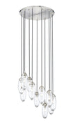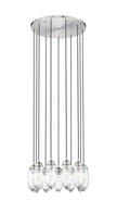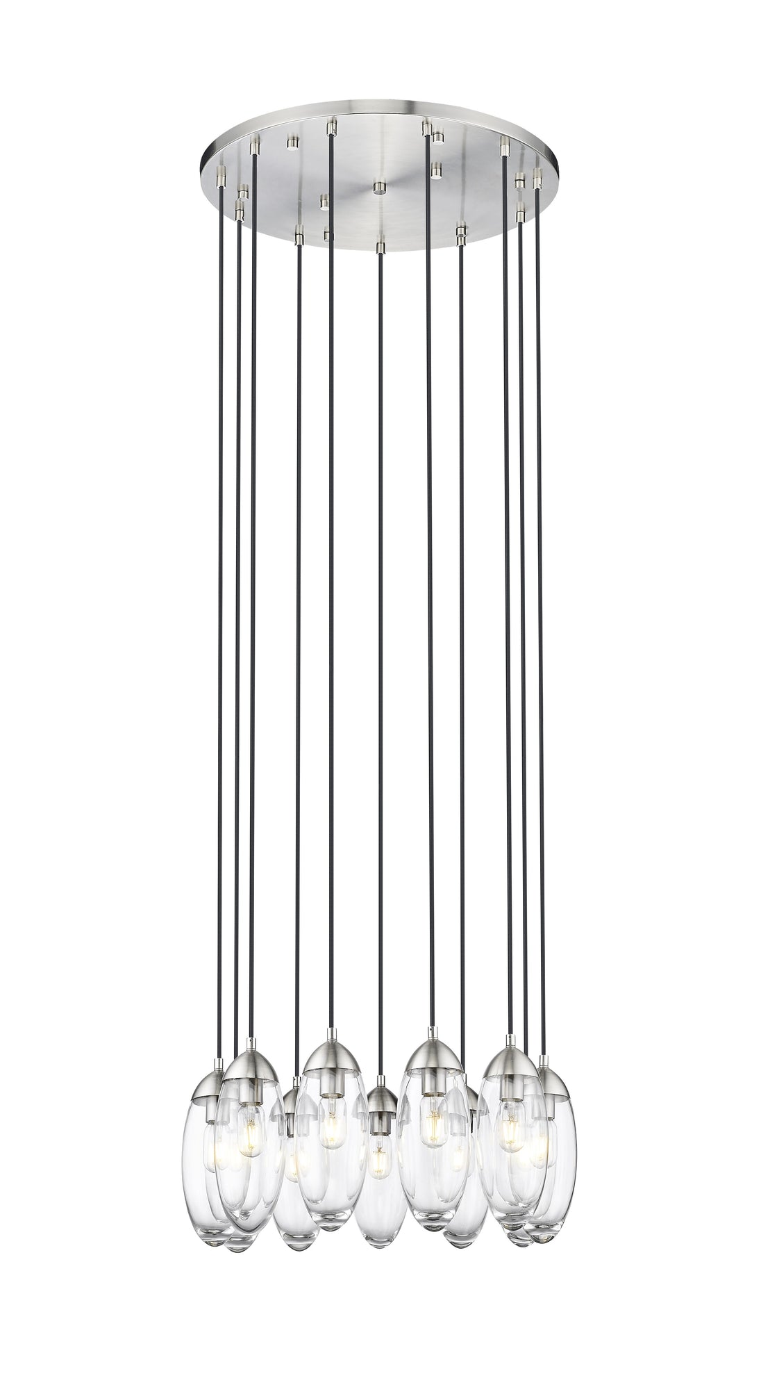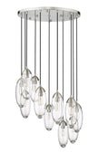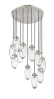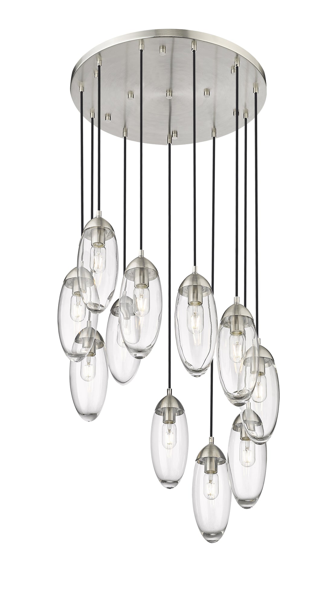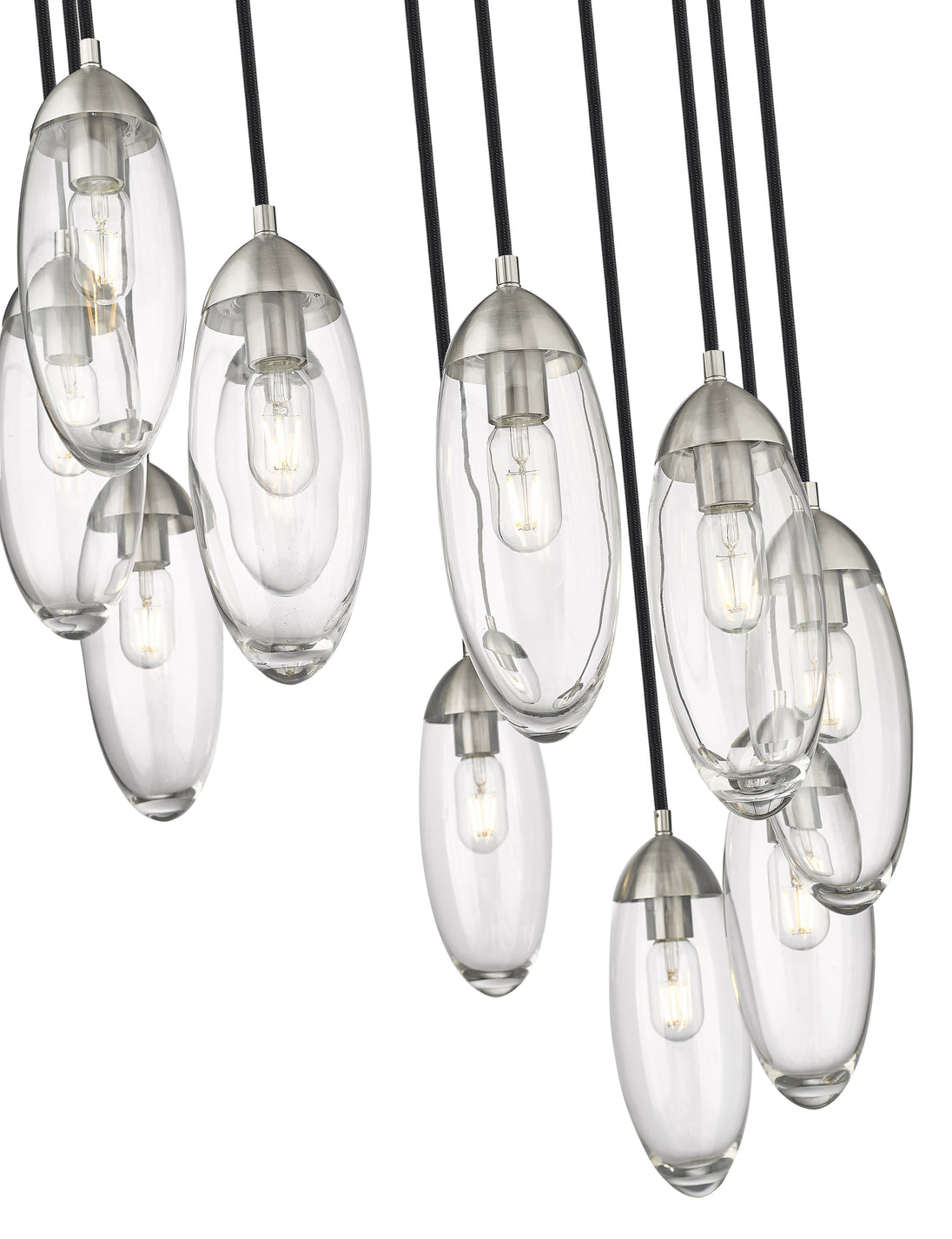 The intimately elegant effect of glasswork adds gleaming radiance to this glam 11-light chandelier. Illumination bounces off of cascading organic teardrop glass shades scattered to offer an abstract silhouette. With a tasteful round brushed nickel finish metal canopy, room or entryway customization becomes a key factor.