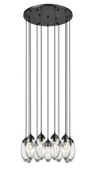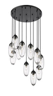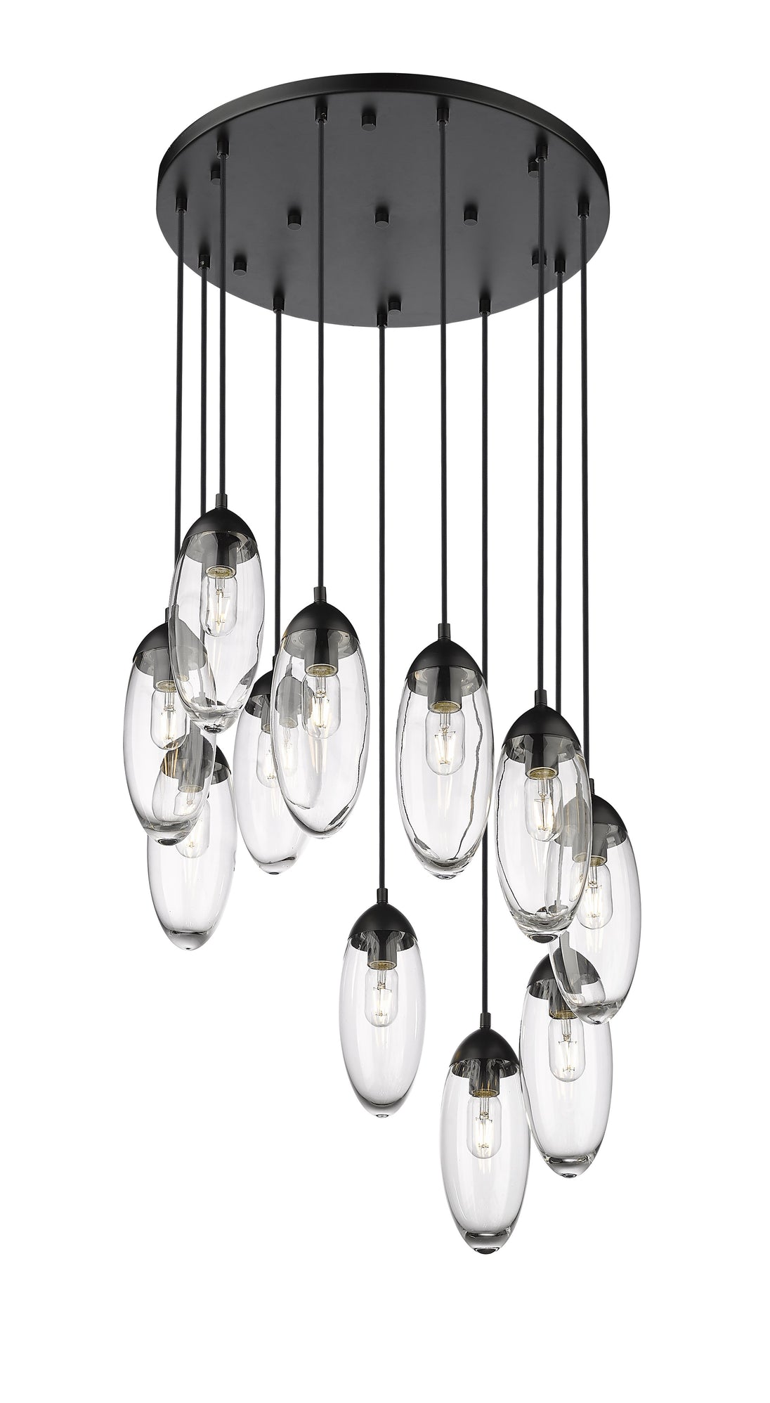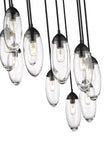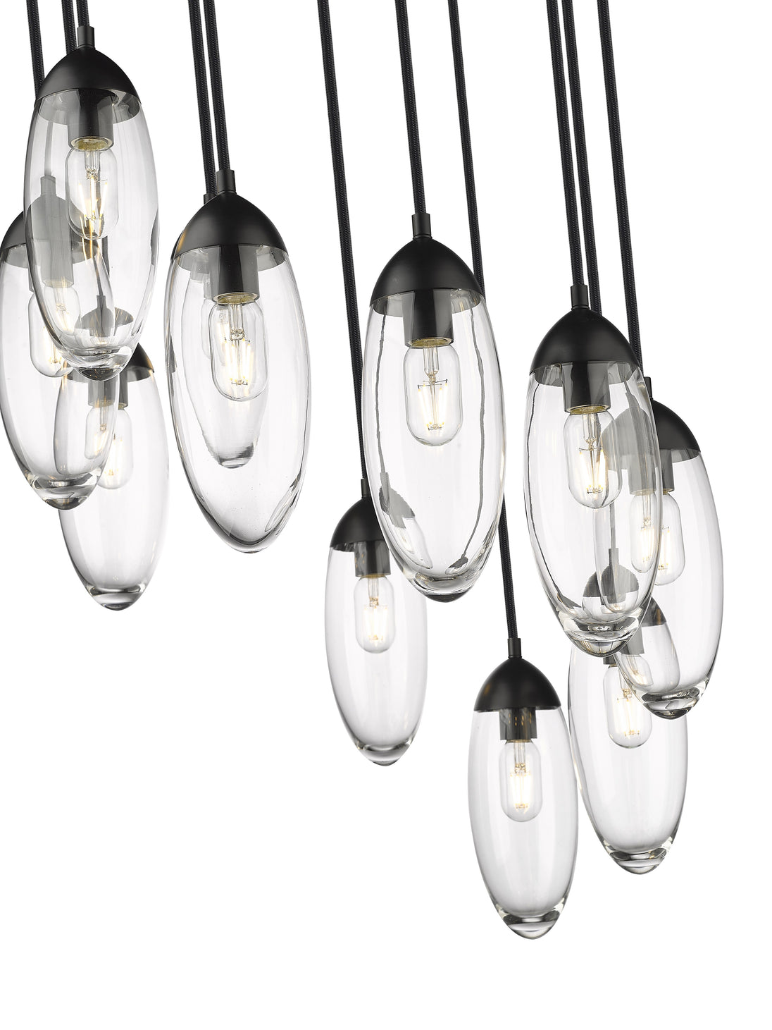 The intimately elegant effect of glasswork adds gleaming radiance to this glam 11-light chandelier. Illumination bounces off of cascading organic teardrop glass shades scattered to offer an abstract silhouette. With a tasteful round matte black finish metal canopy, room or entryway customization becomes a key factor.