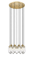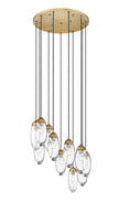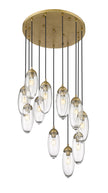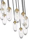 The intimately elegant effect of glasswork adds gleaming radiance to this glam 11-light chandelier. Illumination bounces off of cascading organic teardrop glass shades scattered to offer an abstract silhouette. With a tasteful round rubbed brass finish metal canopy, room or entryway customization becomes a key factor.