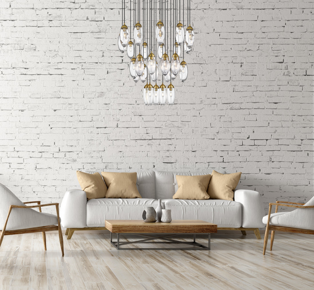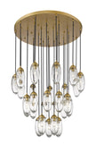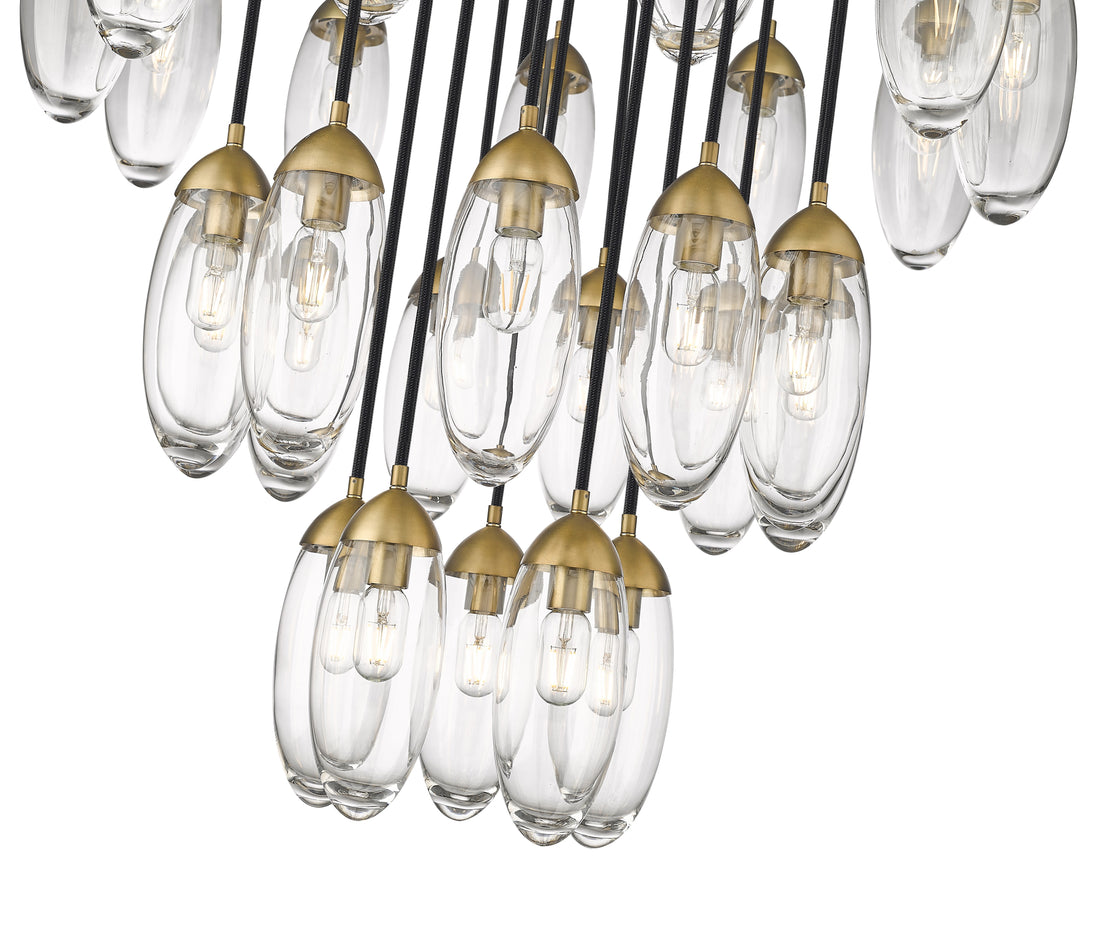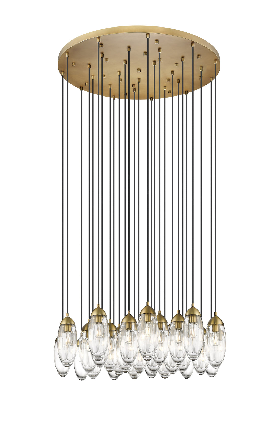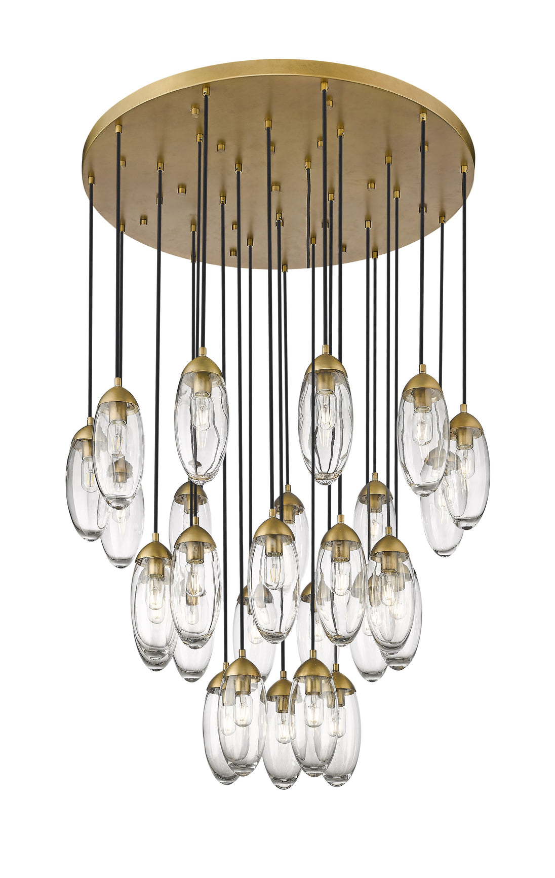 Light reflection plays an enduring role in the design factor of a light fixture with an authentic organic personality. Glam goes a bit easy with this 27-light rounded chandelier representing tempered minimalism as it delivers versatility and artistry. Marvel at the radiance of teardrop glass shades dangling in a circle at graduated lengths from a round rubbed brass finish metal canopy, becoming a focal point in a dining room, living space, or entryway.