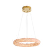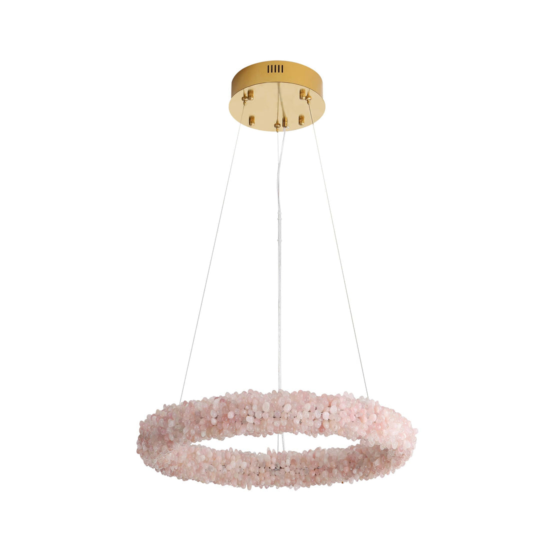 Experience nature-inspired elegance with the Ziva by Golden Lighting Corallo Integrated LED 22in Chandelier. Crafted from exquisite natural gemstones, this chandelier creates a captivating focal point with its unique design. Hand-selected rose quartz stones evoke the tranquility of ocean coral reefs, illuminating the space with a soft, radiant glow when lit. Dry-location rated, this chandelier is perfect for indoor spaces such as dining rooms and living areas, providing an enchanting atmosphere. Sloped-ceiling compatible with an adjustable height design, it can be customized to suit your home. Overall dimensions are 21.63"W x 2.88"H x 21.63"D, featuring integrated LED technology for brilliant, energy-efficient illumination with a long-lasting light source that provides 4540.38 rated lumens at a 3000K CCT. Discover the perfect blend of organic beauty and modern functionality in your living spaces.