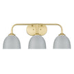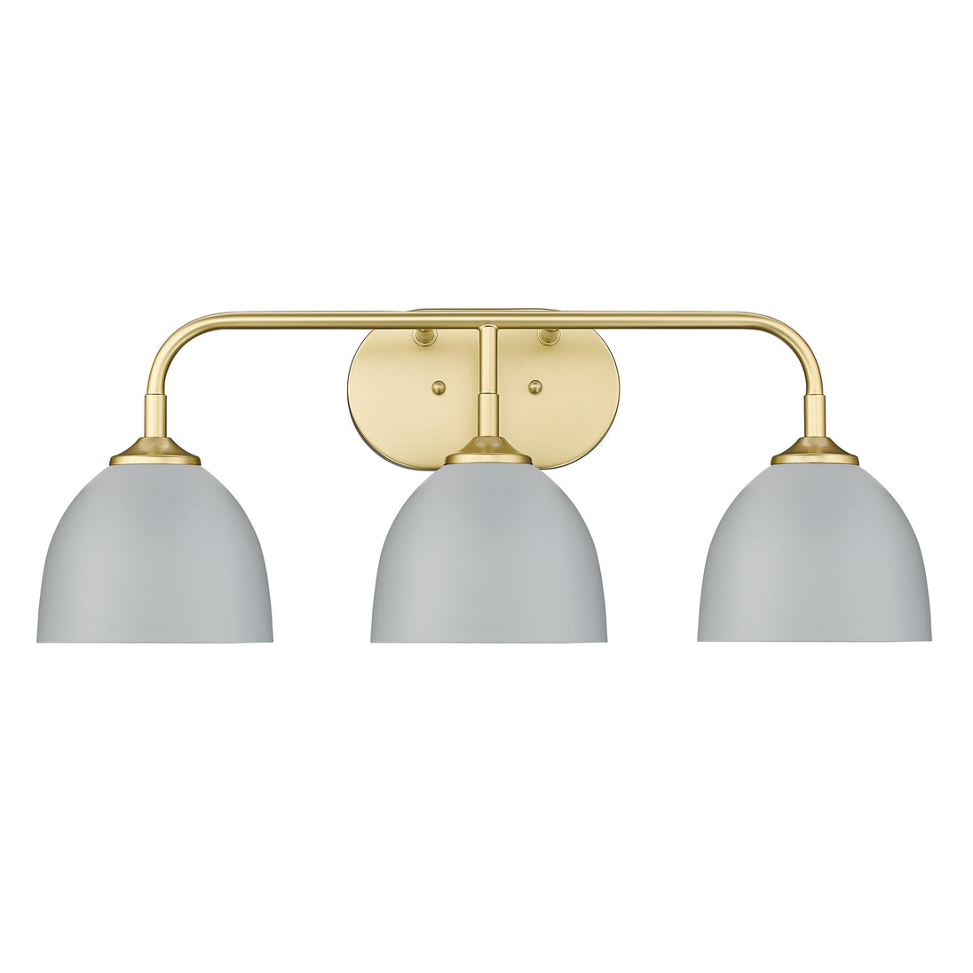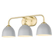 Bring farmhouse elegance into your home with the Yep by Golden Lighting Zoey 3-light Vanity. Featuring a metal shade and an Olympic Gold frame, it creates a welcoming atmosphere. The matte gray shade offers a cool contemporary touch, absorbing light for an inviting visual effect. Our Olympic Gold finish is a chic, soft hue that diffuses light beautifully, adding warmth to your space. Designed for bathrooms, this fixture is damp location rated for covered areas, perfect for practical illumination. Requires 3 E26 medium base bulbs (not included) and measures 24.5"W x 9.5"H x 7.25"D. Transform your bathroom space with this charming fixture that blends functionality with quality.