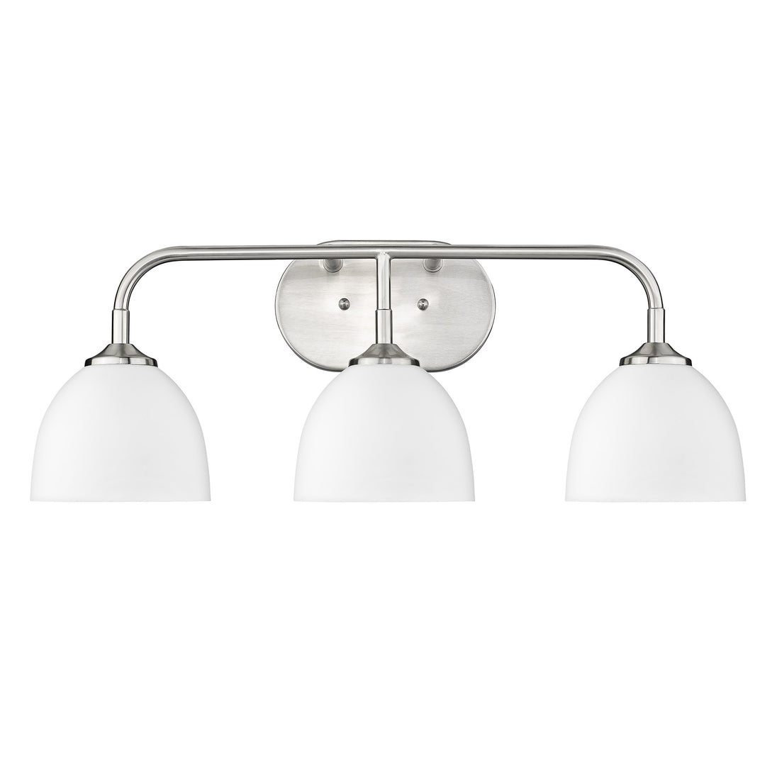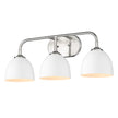 Bring farmhouse elegance into your home with the Yep by Golden Lighting Zoey 3-light Vanity. Featuring a metal shade and a pewter frame, it creates a welcoming atmosphere. The bright, matte white shade absorbs light while offering a clean, modern look, enhancing the rustic ambiance. Our Pewter finish provides a timeless appeal, crafted with durable electroplating and a fine brushing technique for a lustrous glow. Ideal for bathrooms and damp locations, it’s designed to withstand occasional moisture. Measures 24.5"W x 9.5"H x 7.25"D and requires 3 E26 medium base bulbs (not included) with a maximum wattage of 100 per bulb. Elevate your bathroom with this versatile fixture that combines style and practicality.