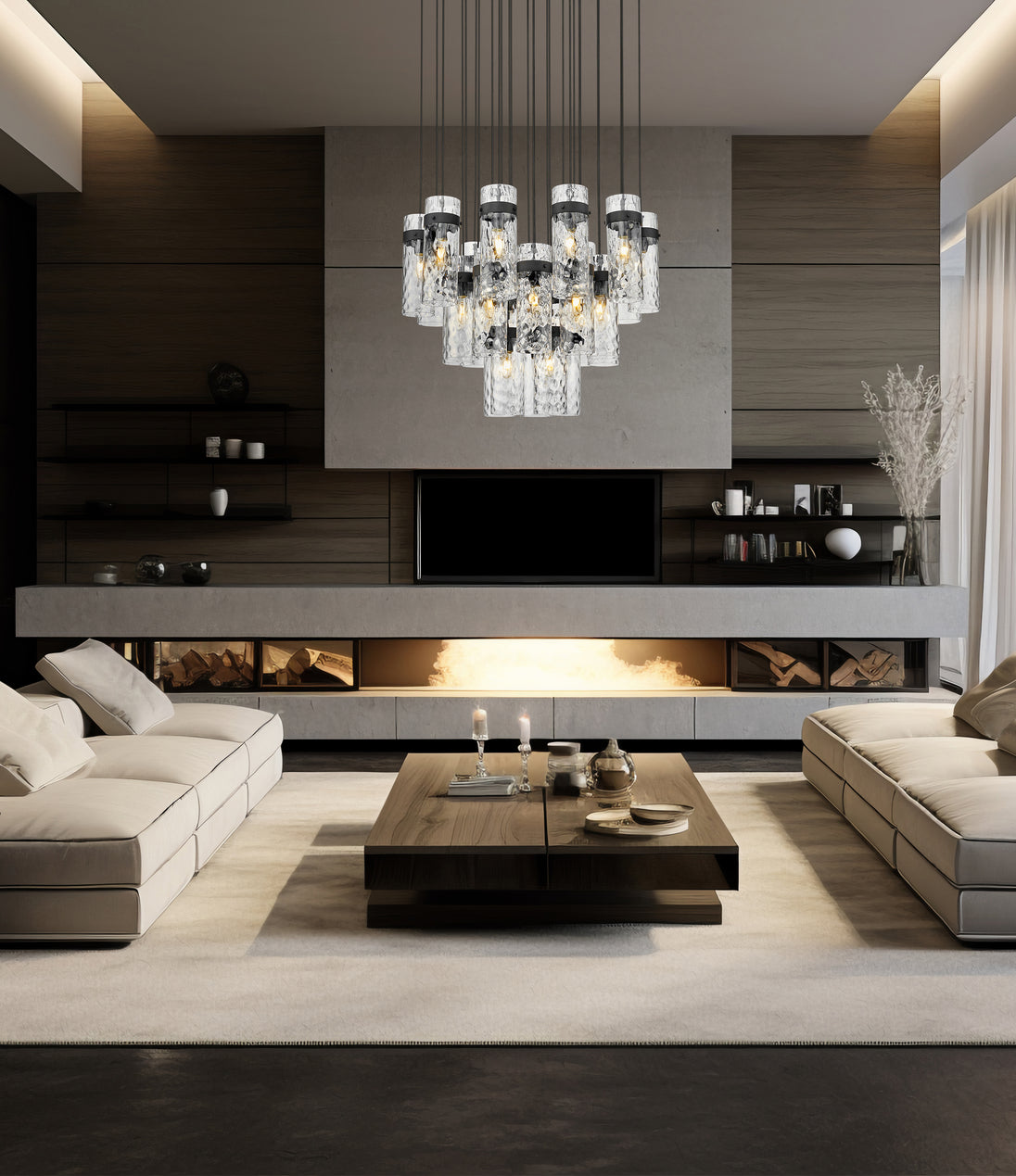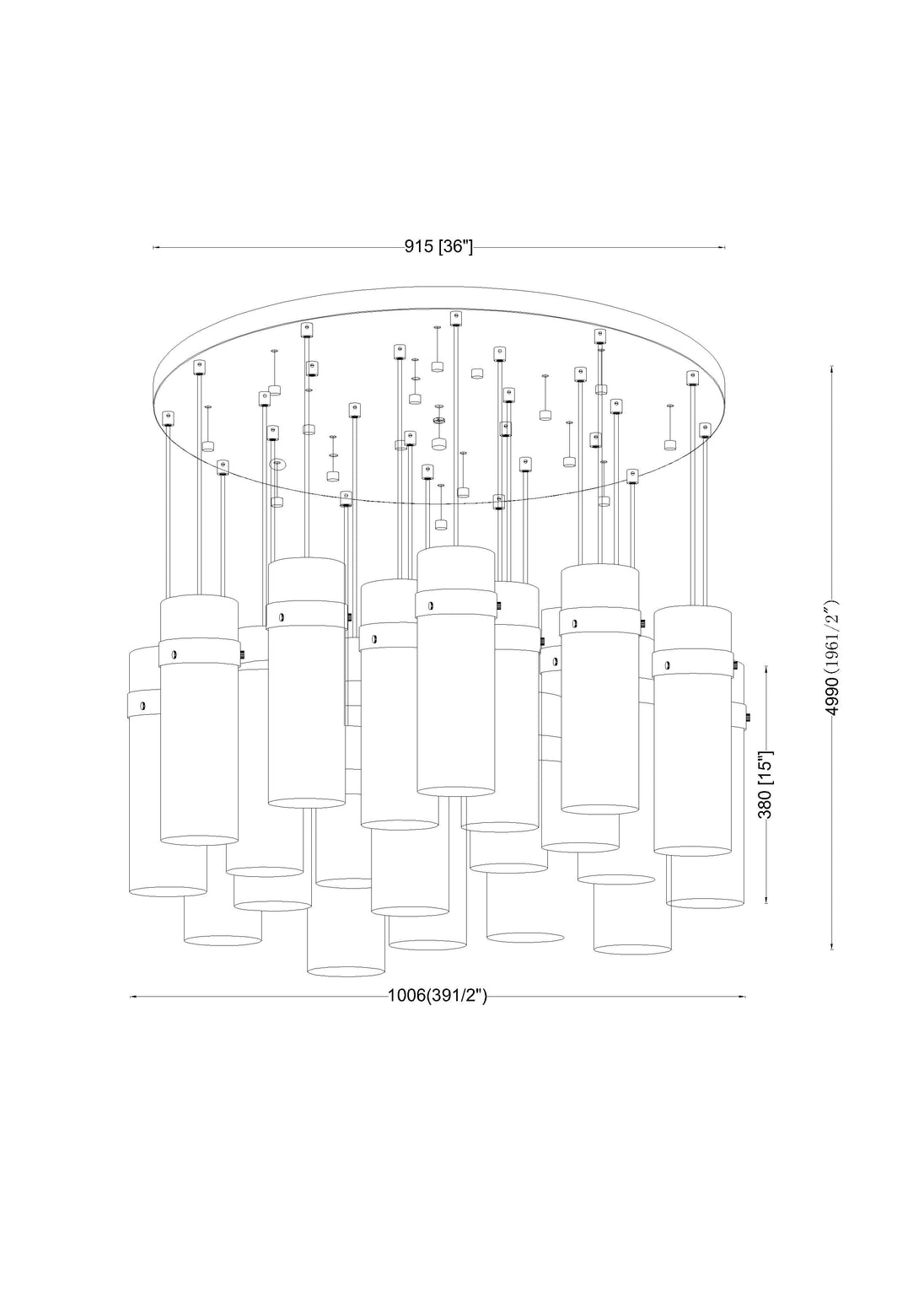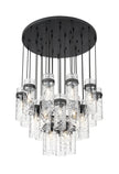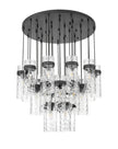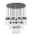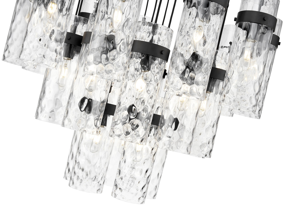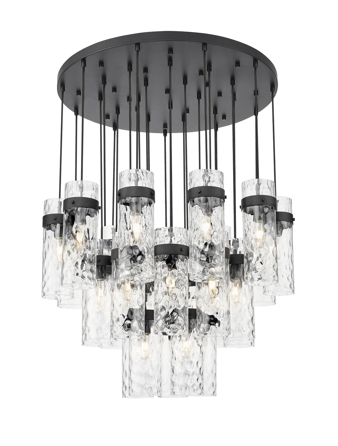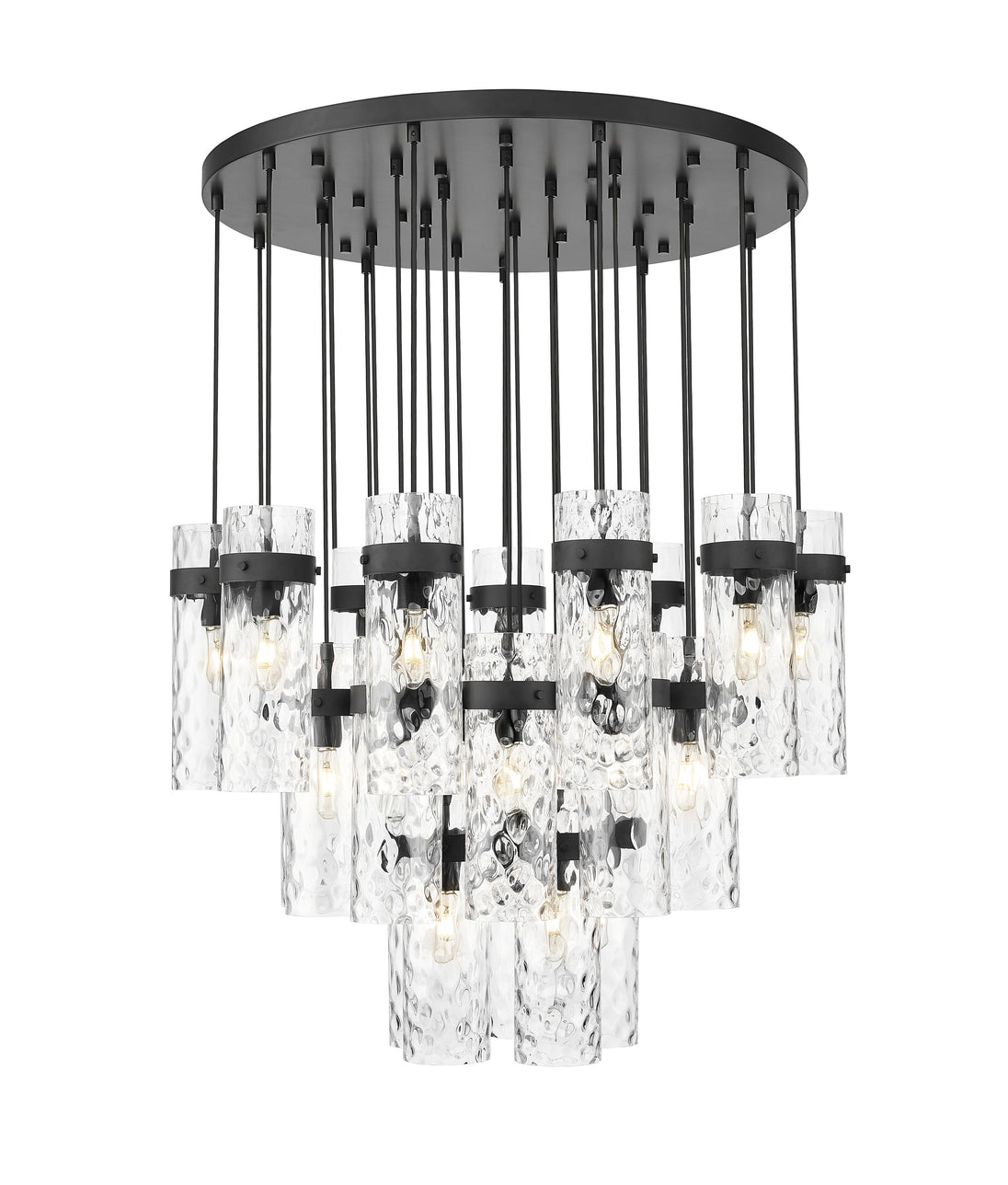 Cool matte black brings distinctive contrast and depth to this modern 27-light chandelier. Its round canopy anchors the fixture, while cylindrical water glass shades are complemented with matching collars and braided trim. The tiered configuration of lights creates an opulent presentation, gorgeous over luxe living and dining rooms.