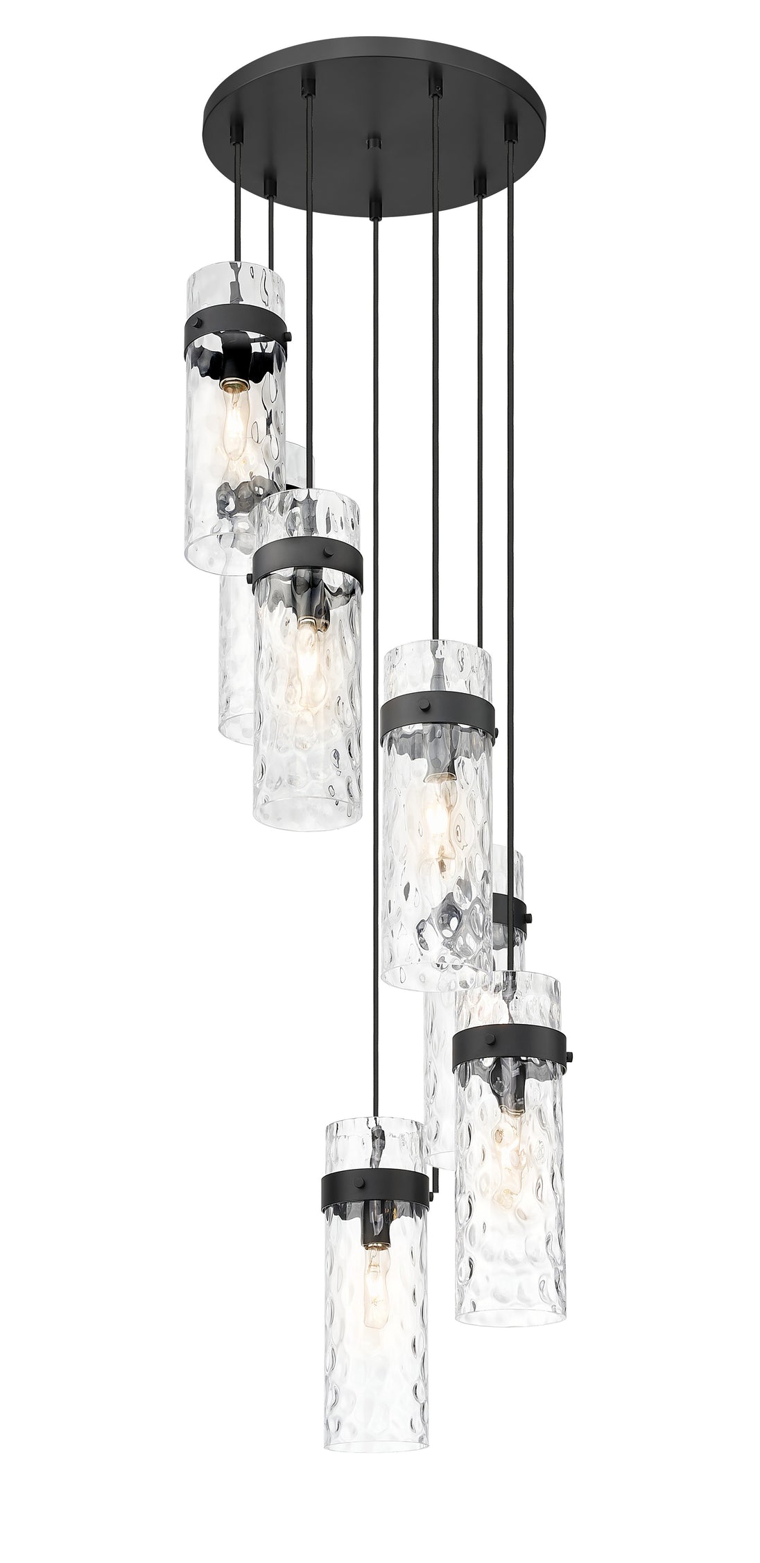 Upgrade your dining room or staircase with the refined opulence of this modern seven-light chandelier. From the Fontaine collection, it boasts a matte black finish over a round canopy and metal collars, creating rich depth and contrast in your living or dining room. Its cylindrical shades show off clear water glass, offering a rippled effect perfect for sophisticated spaces.
