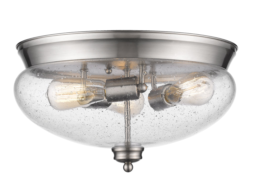 Oblate glass shades influenced by the school house globes of old, the Amon family puts a contemporary spin on a traditional classic. Vintage inspired seedy glass paired with sleek modern finishes create a bold yet classic look. Finishes include Satin Gold, Brushed Nickel, Chrome and Olde Bronze.