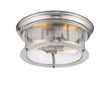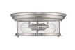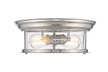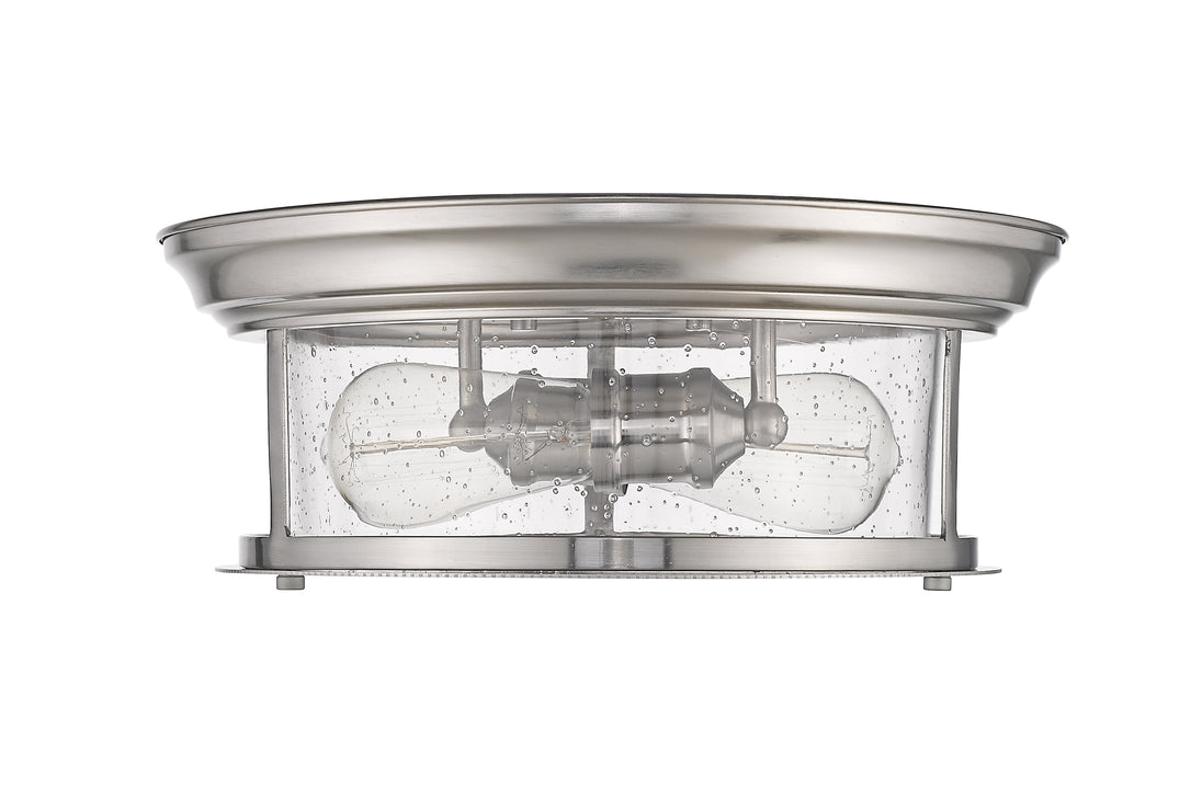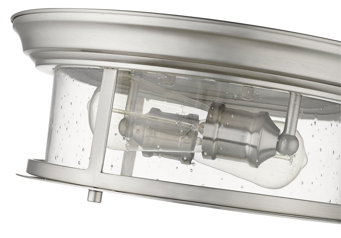 Cool industrial ambiance offers a stylish look to transitional spaces in need of functional, fashionable fixtures. With gorgeous Brushed Nickel finish metal providing a circular cage-like frame and a wide cylindrical clear seedy glass shade completing its visual package, this two-light flush mount ceiling light offers a focal point in a redesigned space devoted to carefree living.