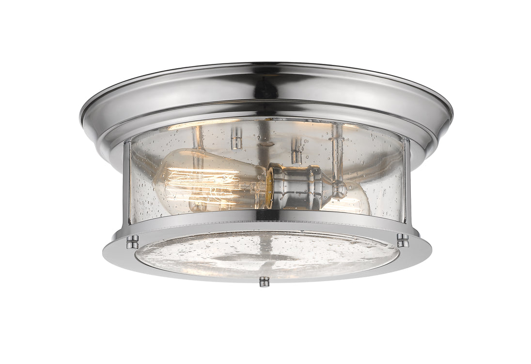 Cool industrial ambiance offers a stylish look to transitional spaces in need of functional, fashionable fixtures. With brilliant Chrome finish metal providing a circular cage-like frame and a wide cylindrical clear seedy glass shade completing its visual package, this two-light flush mount ceiling light offers a focal point in a redesigned space devoted to carefree living.