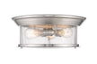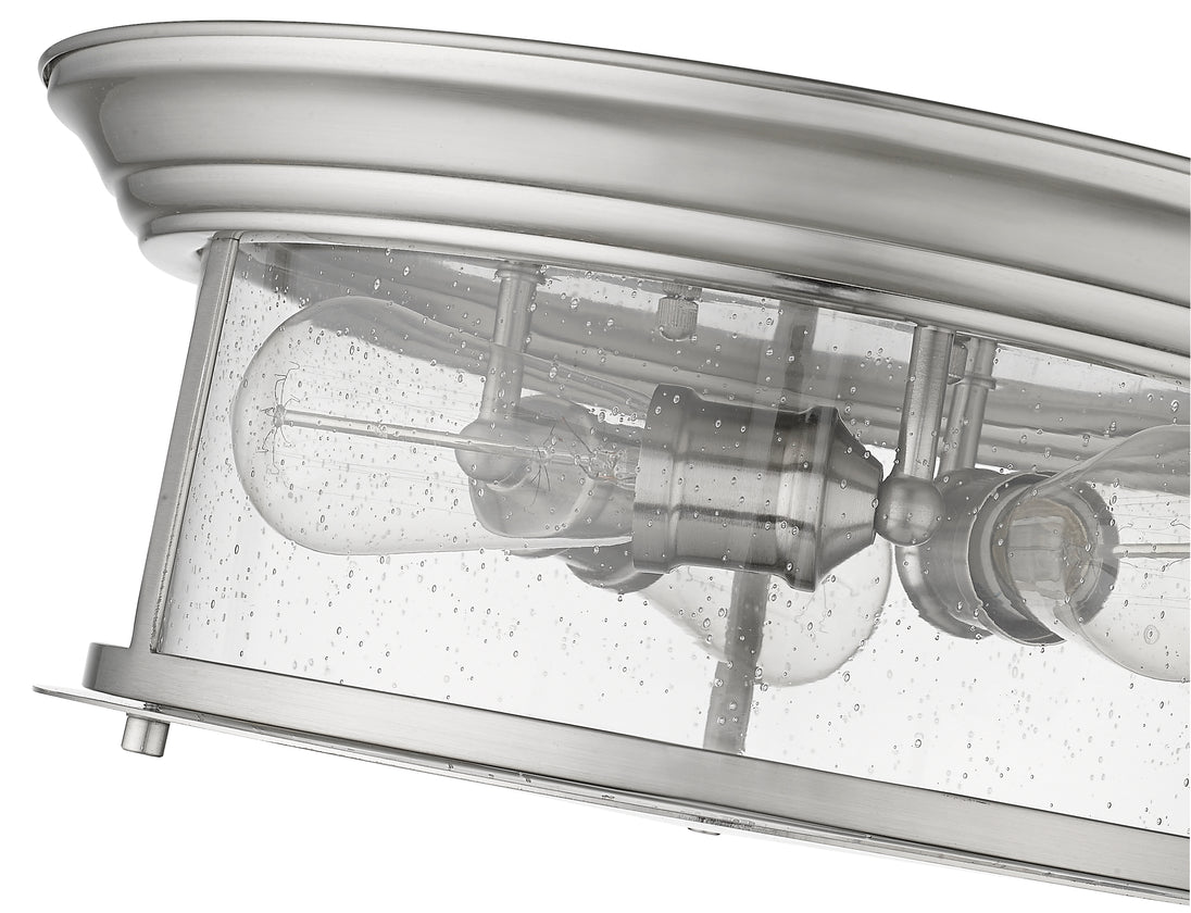 Cool industrial ambiance offers a stylish look to transitional spaces in need of functional, fashionable fixtures. With gorgeous Brushed Nickel finish metal providing a circular cage-like frame and a wide cylindrical clear seedy glass shade completing its visual package, this three-light flush mount ceiling light becomes an integral part of an overall design scheme as it delivers ambient lighting.