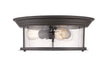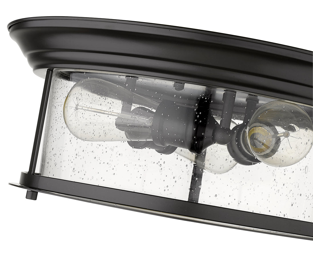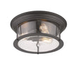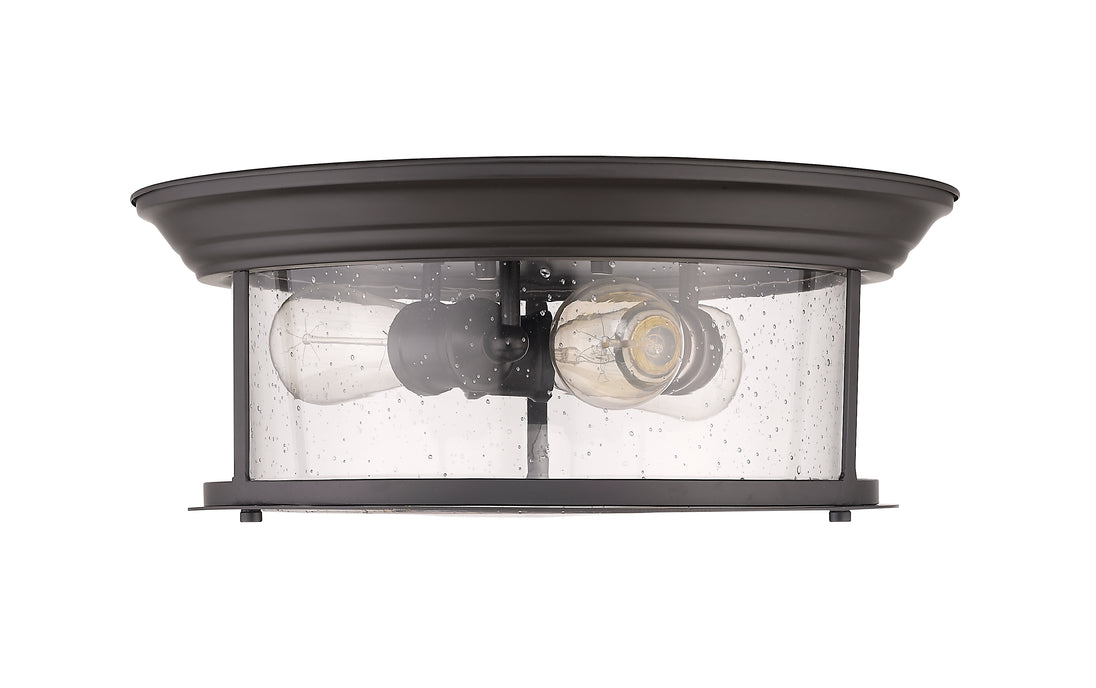 Cool industrial ambiance offers a stylish look to transitional spaces in need of functional, fashionable fixtures. With beautiful Bronze finish metal providing a circular cage-like frame and a wide cylindrical clear seedy glass shade completing its visual package, this three-light flush mount ceiling light becomes an integral part of an overall design scheme as it delivers ambient lighting.