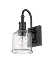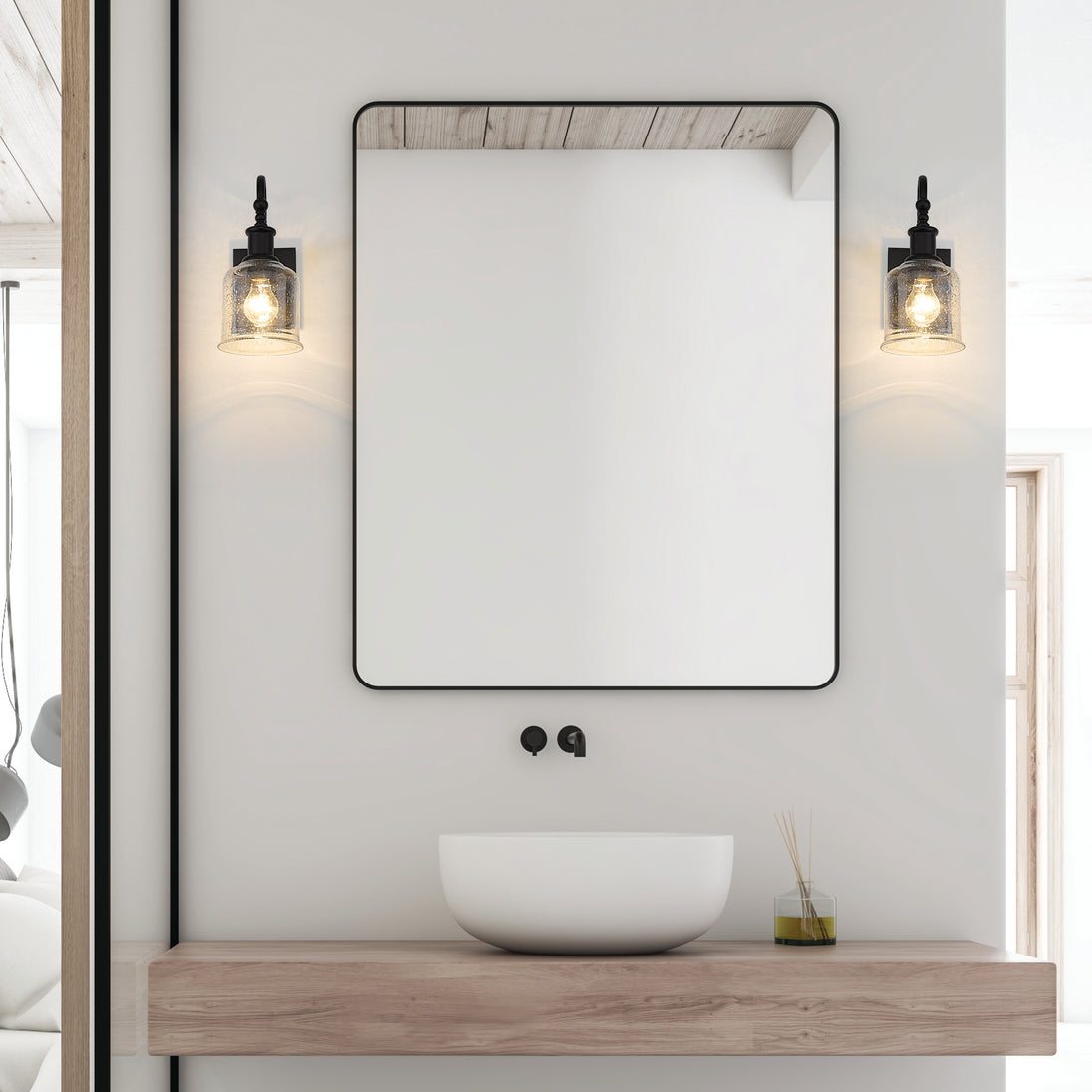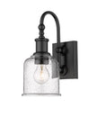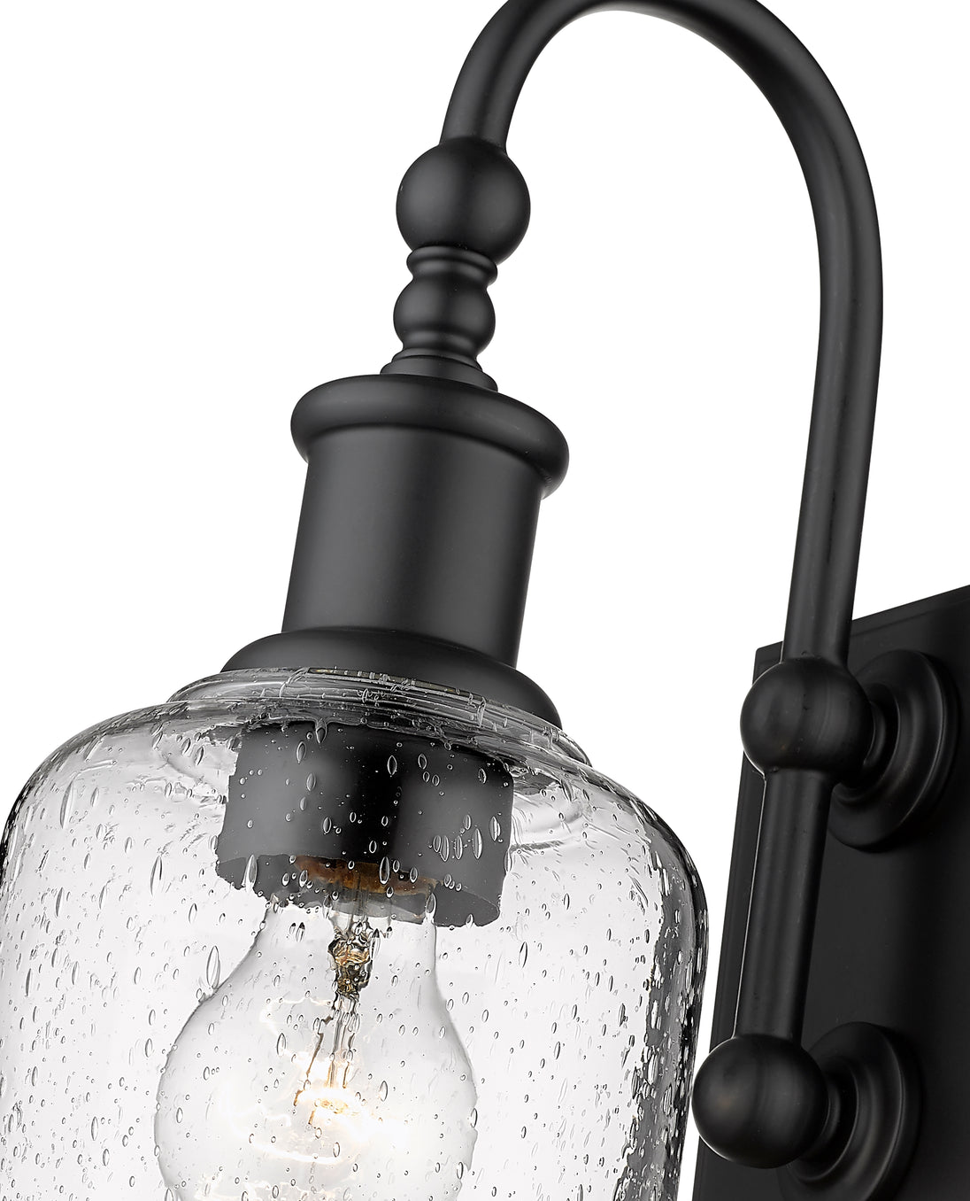 Soft nautical vibes bring a nostalgic romantic vibe to the Bryant one-light wall sconce. Create a themed visual with this tasteful fixture crafted of bold matte black finish steel, contrasting beautifully with a romantic clear seedy glass shade. A curved arm and lipped shade generate extra charm that stylizes a custom bath space, dining area, or main living room.