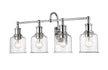 Village-inspired charm borrows from a nautical theme to create an inspiring look for traditional and transitional bath spaces in this four-light vanity from the Bryant collection. With a brilliant chrome finish steel frame and wall mount, its romantic clear seedy glass shades blend with beauty. A curved arm, ornate holders, and lipped shades generate extra charm that stylize a custom bath space.