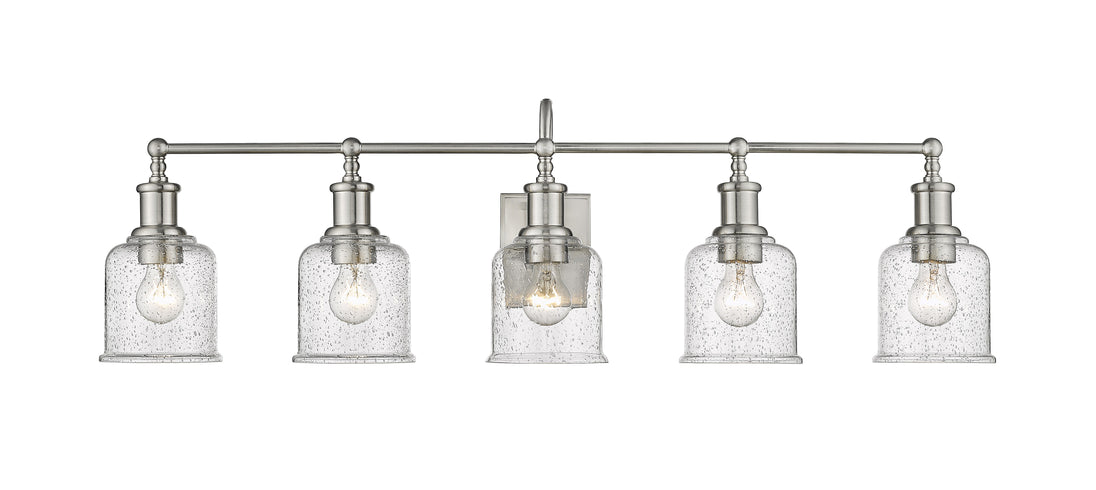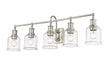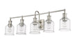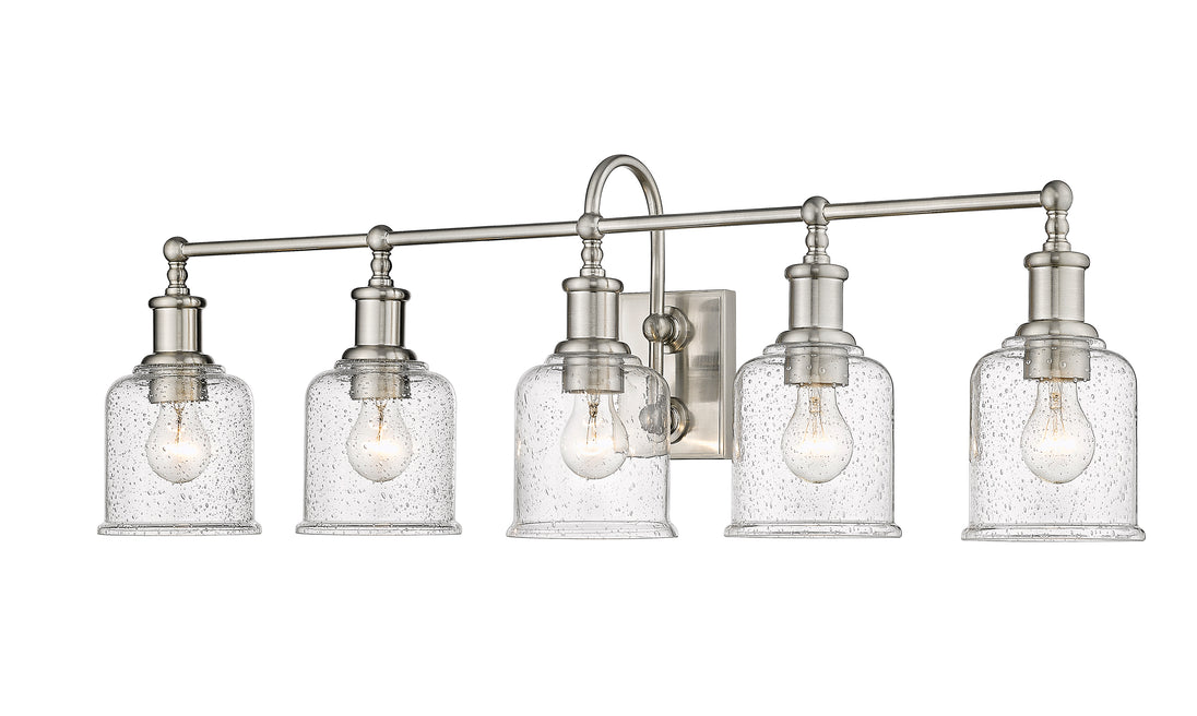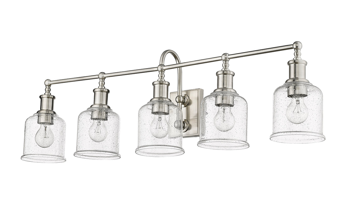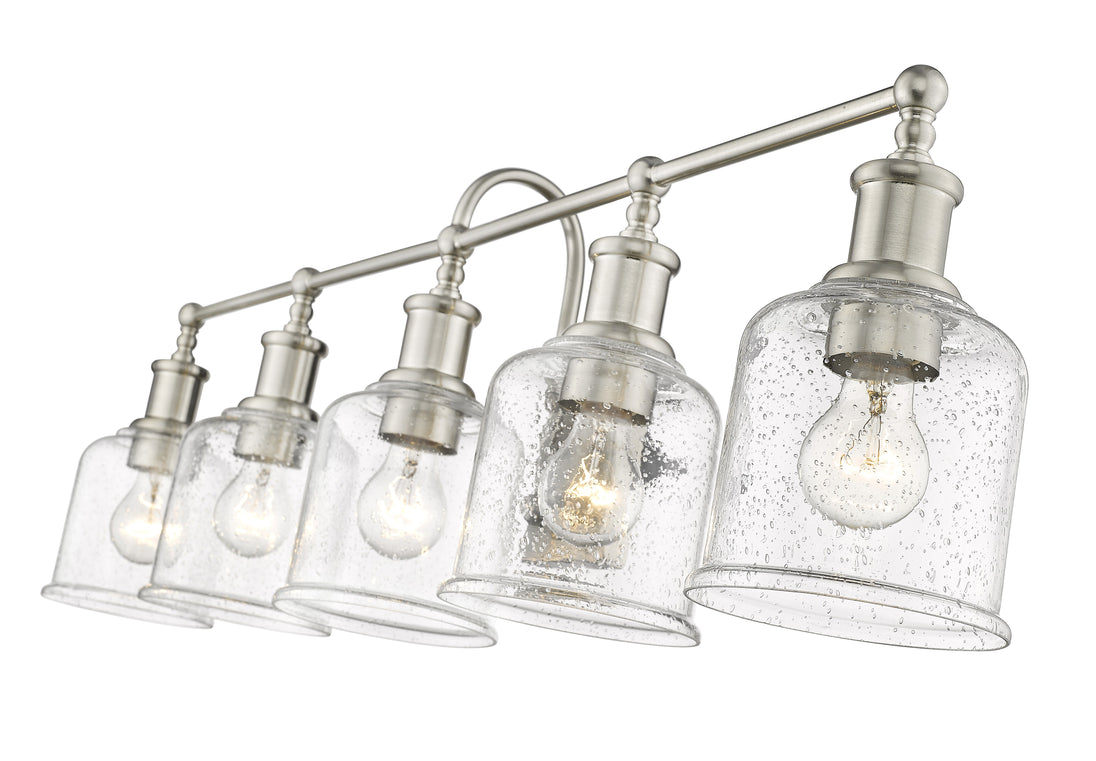 Add radiant lighting to a master or guest bath space with this stylish five-light vanity light from the Bryant collection. A gooseneck arm pads the vintage nautical aesthetic of this chic light that features a frame and holders made of cool brushed nickel finish steel. Lipped clear seedy glass shades continue its soft style and add an artful emphasis.