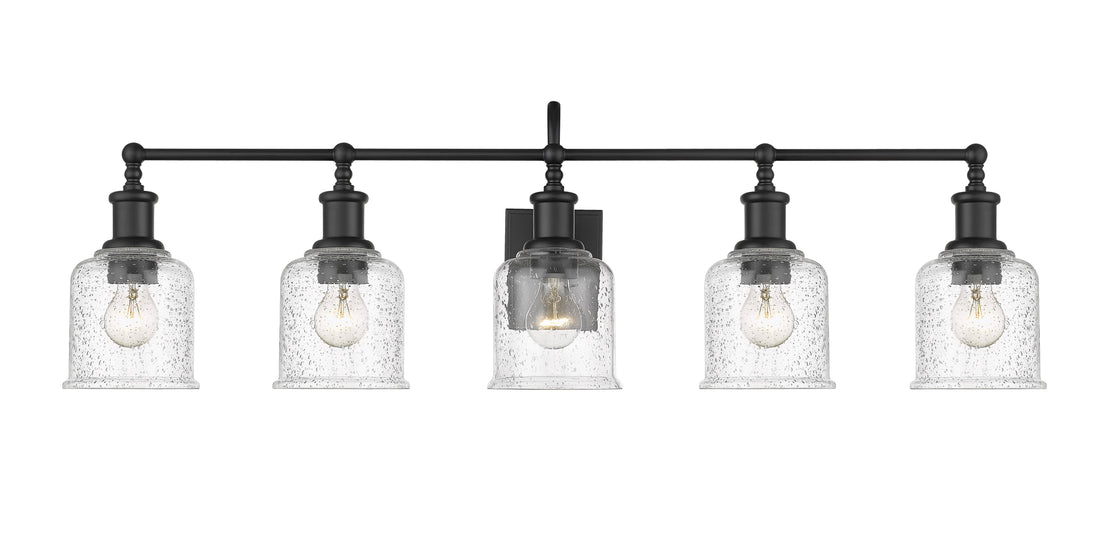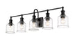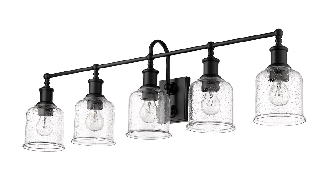 Add fashionable lighting to a master or guest bath space with this stylish five-light vanity light from the Bryant collection. A gooseneck arm pads the vintage nautical aesthetic of this chic light that features a frame and holders made of bold matte black finish steel. Lipped clear seedy glass shades continue its soft style and add an artful emphasis.