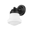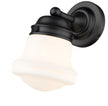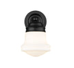 Low-key and tasteful, this one-light wall sconce from the Vaughn collection lifts the mood in a casual space with a charming village-inspired theme. Blending nautical with industrial, this sconce features matte opal schoolhouse glass in a unique shape, nestled to a striking matte black finish steel frame with a dimensional round wall mount and holder and an extra accent piece.