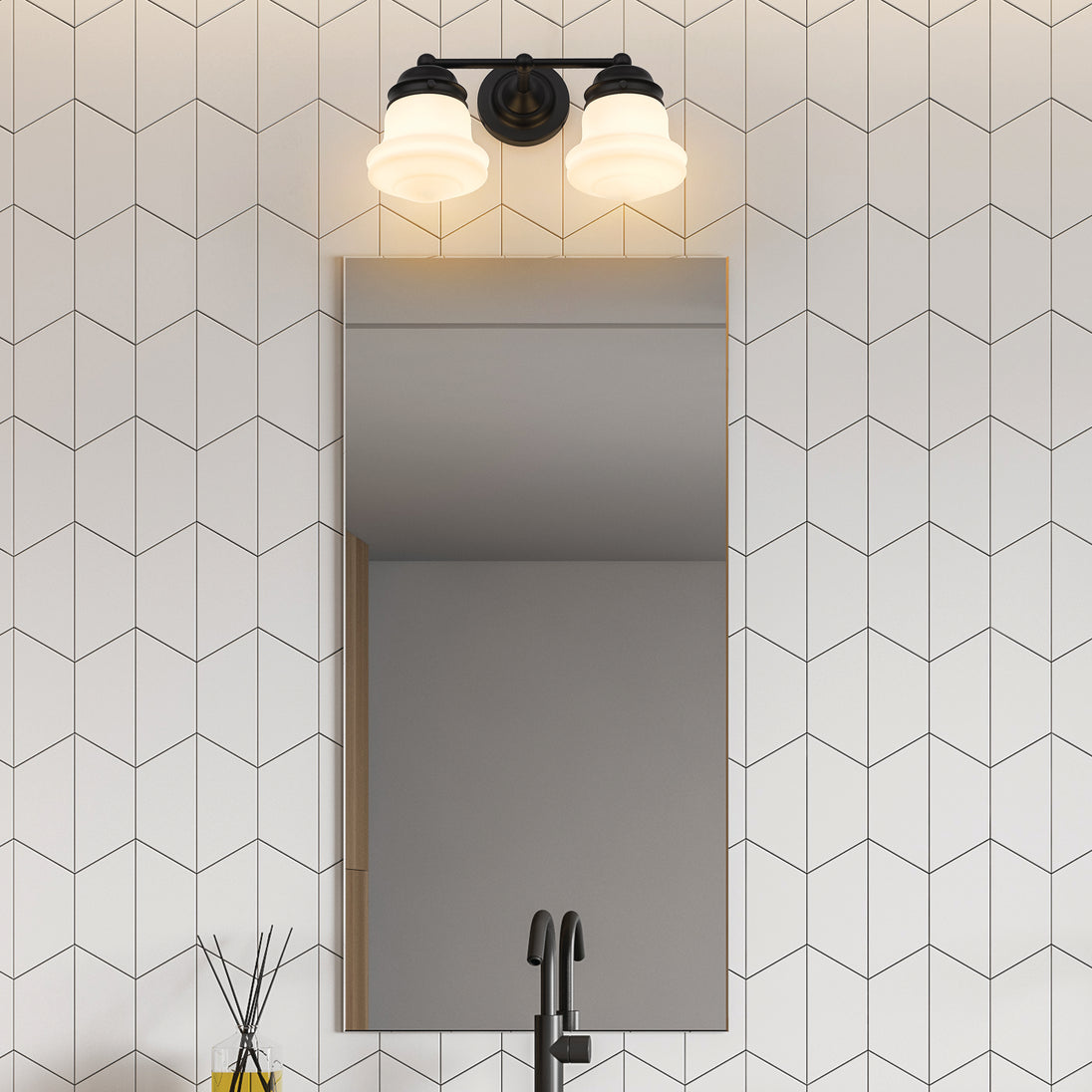 Charming, festive style goes light as it lights up a bath space with this two-light vanity from the Vaughn collection. Illuminate a compact vanity with a themed fixture borrowing from nautical and industrial, formed of matte black finish steel and featuring unique schoolhouse opal glass shades. This light becomes a central focus in a transitional or modern bathroom.