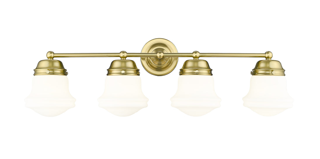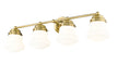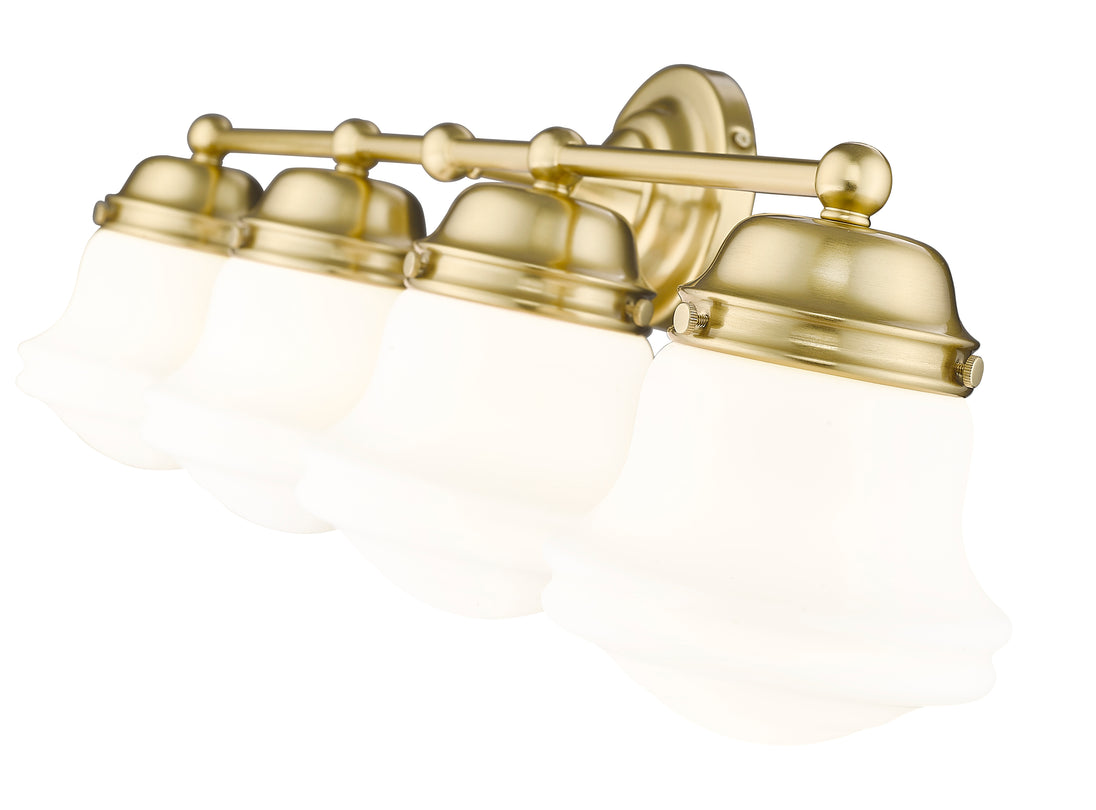 A modern four-light vanity light is infused with vintage charm, owing to its schoolhouse glass and graceful curves. The delightful design features a gleaming luxe gold finish that highlights its depth and detail, with matte opal glass that ensures true but diffused illumination perfect for daily grooming and beauty rituals at your vanity.