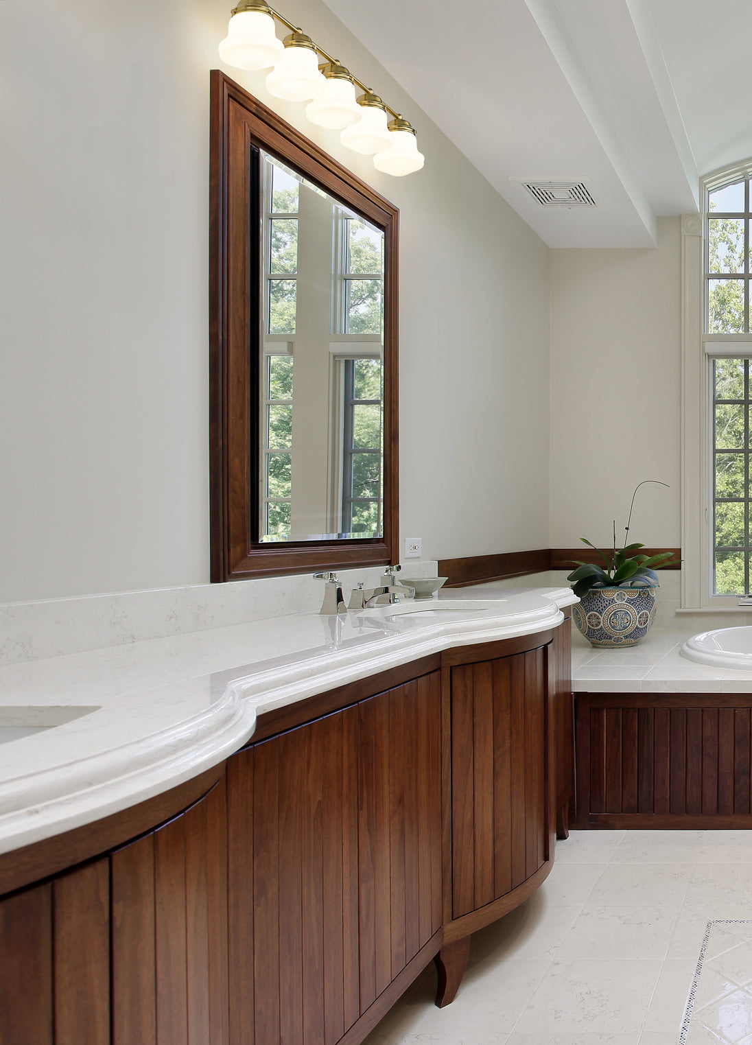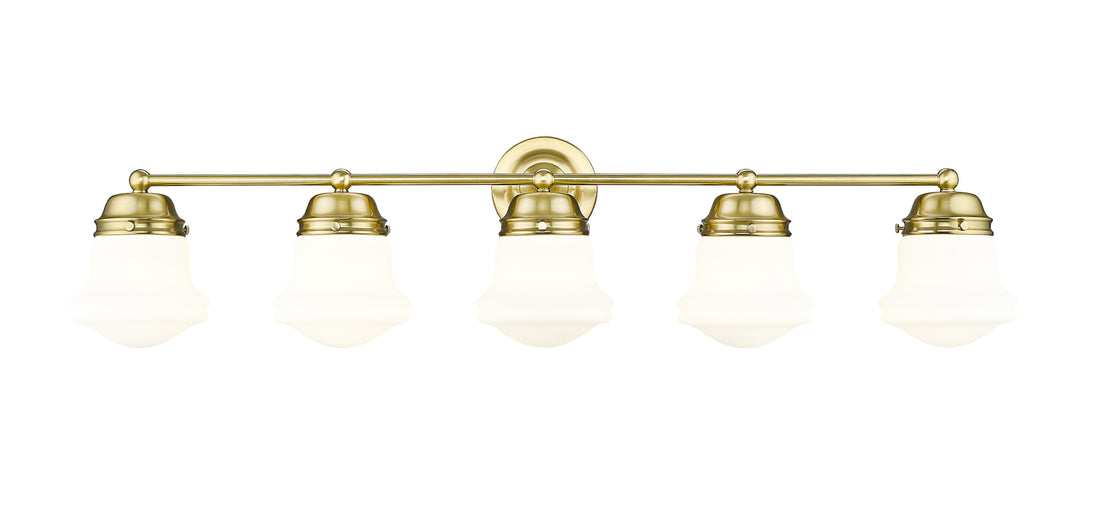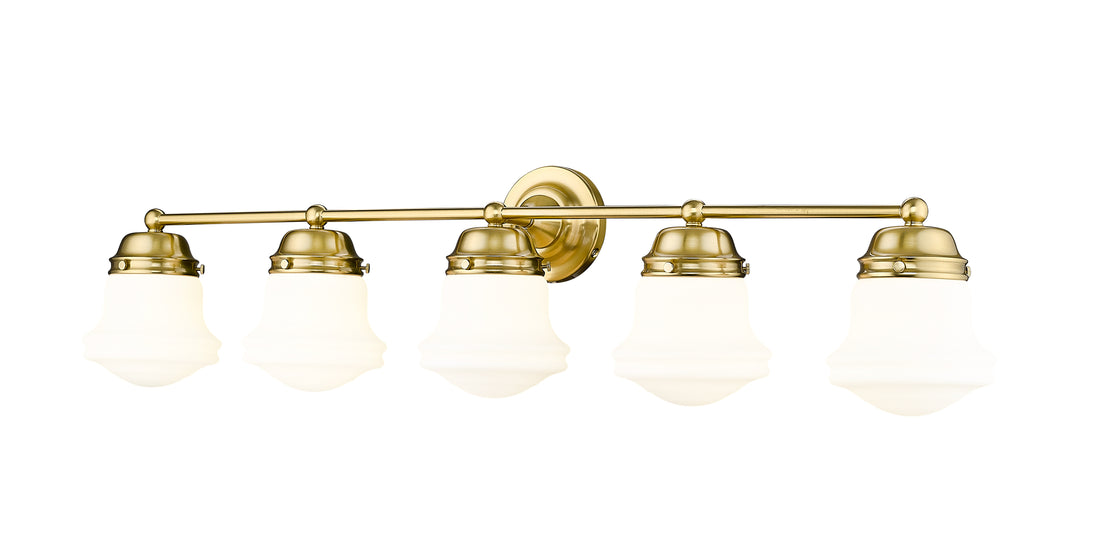 Span our vanity with a modern five-light bathroom fixture that pairs vintage schoolhouse glass with graceful curves to create a chic look and feel. Perfect for a variety of spaces, it showcases matte opal glass for exceptional, diffused illumination and pairs with a stylish luxe gold finish to create a rich, refined ambiance in your bath.