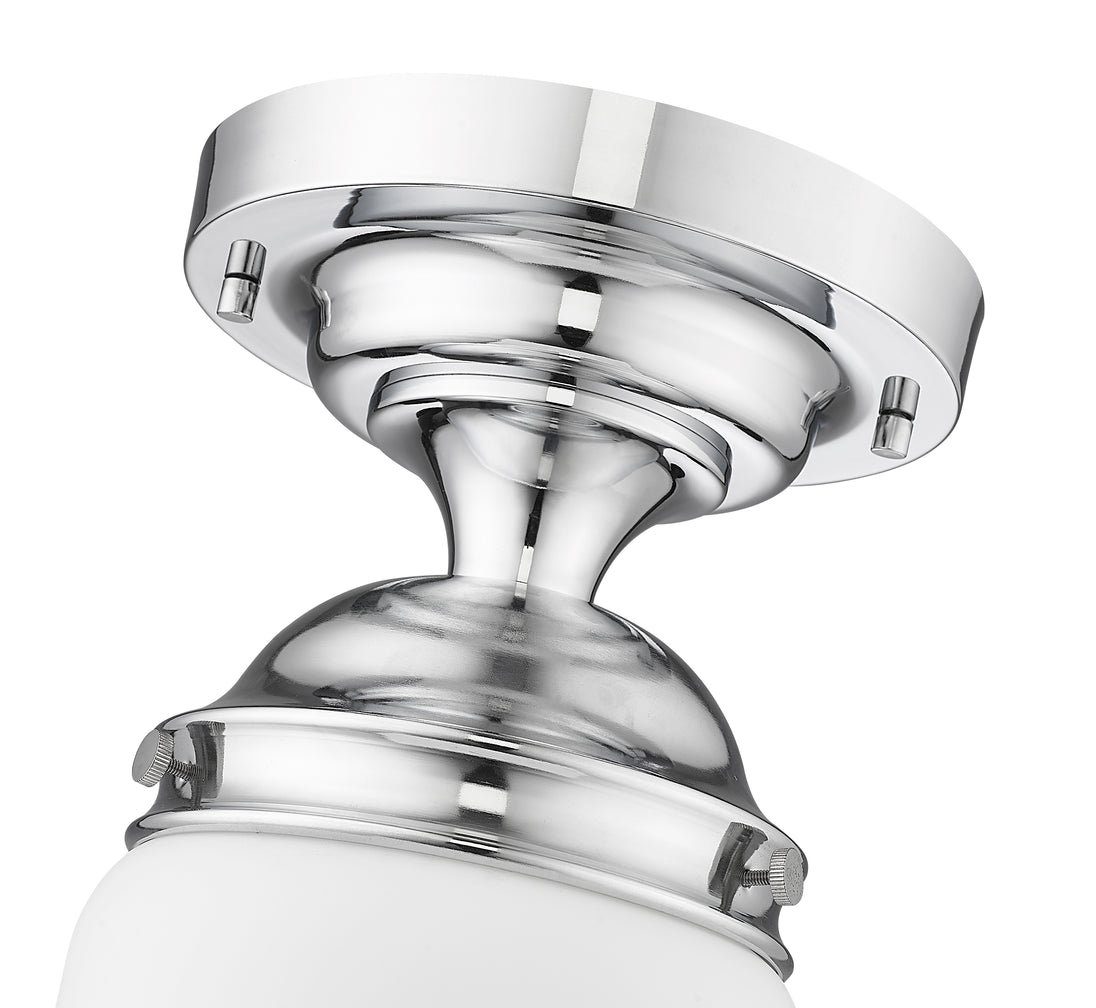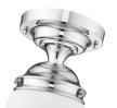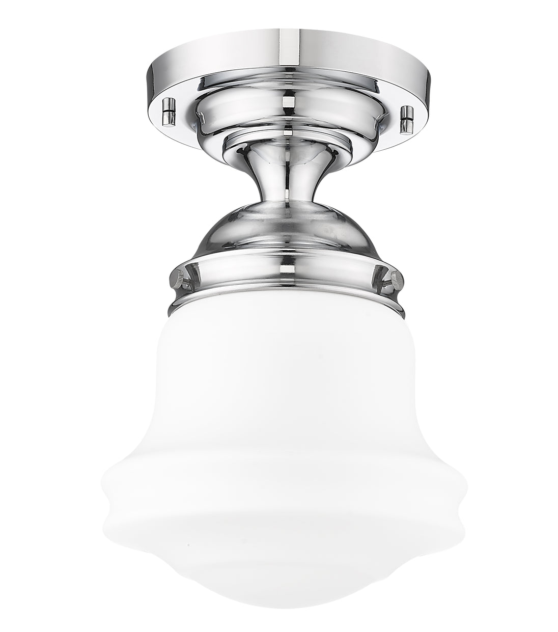Upgrade home lighting with a modern one-light flush mount ceiling light with vintage inspirations. Borrowing from Mid-Century motifs, it boasts matte opal schoolhouse glass to complement a decorative mounting in a versatile chrome finish. Perfect for a walk-in closet, powder, room, bedroom, and beyond.