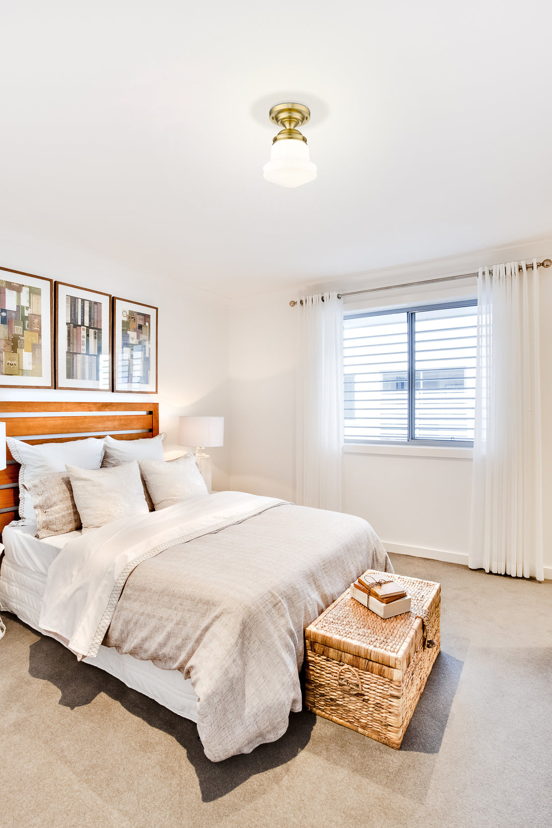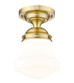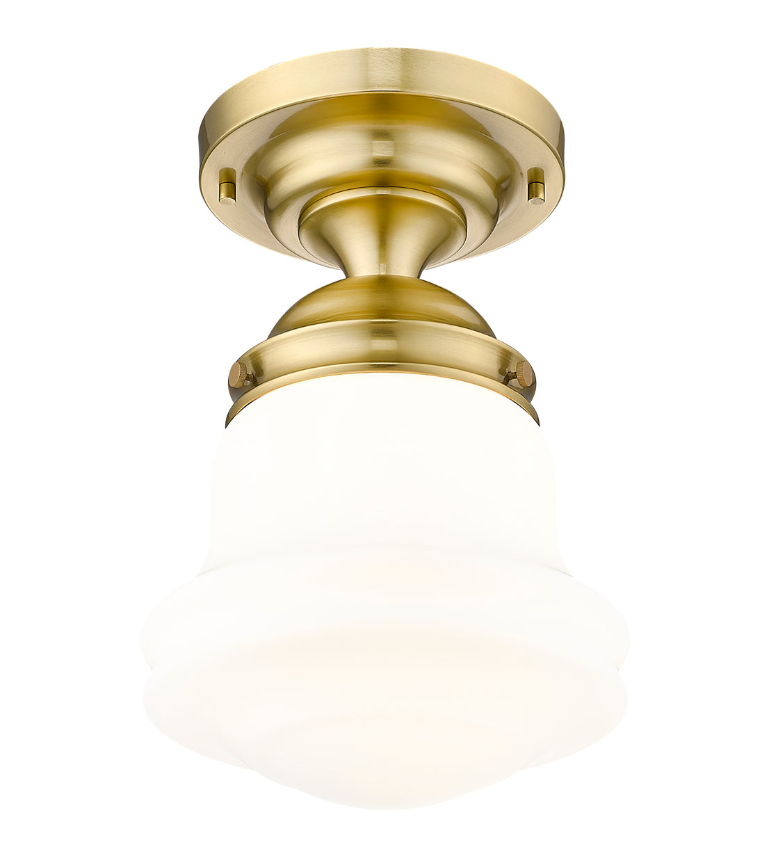 Upgrade home lighting with a modern one-light flush mount ceiling light with vintage inspirations. Borrowing from Mid-Century motifs, it boasts matte opal schoolhouse glass to complement a decorative mounting in a rich luxe gold finish. Perfect for a walk-in closet, powder, room, bedroom, and beyond.