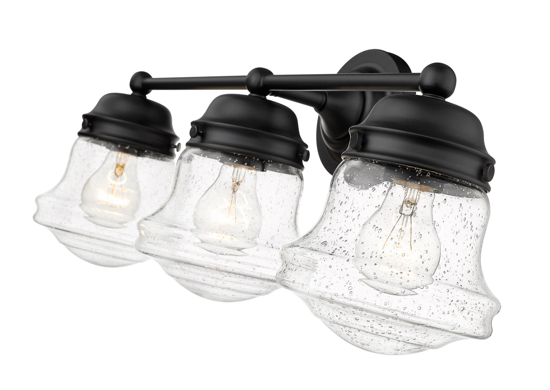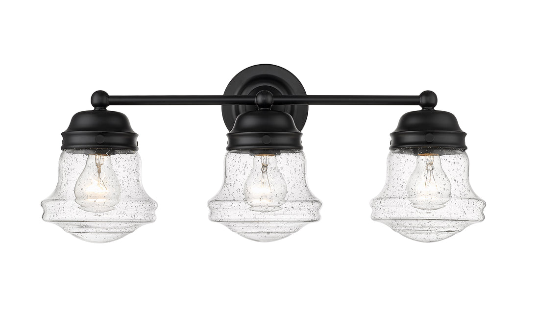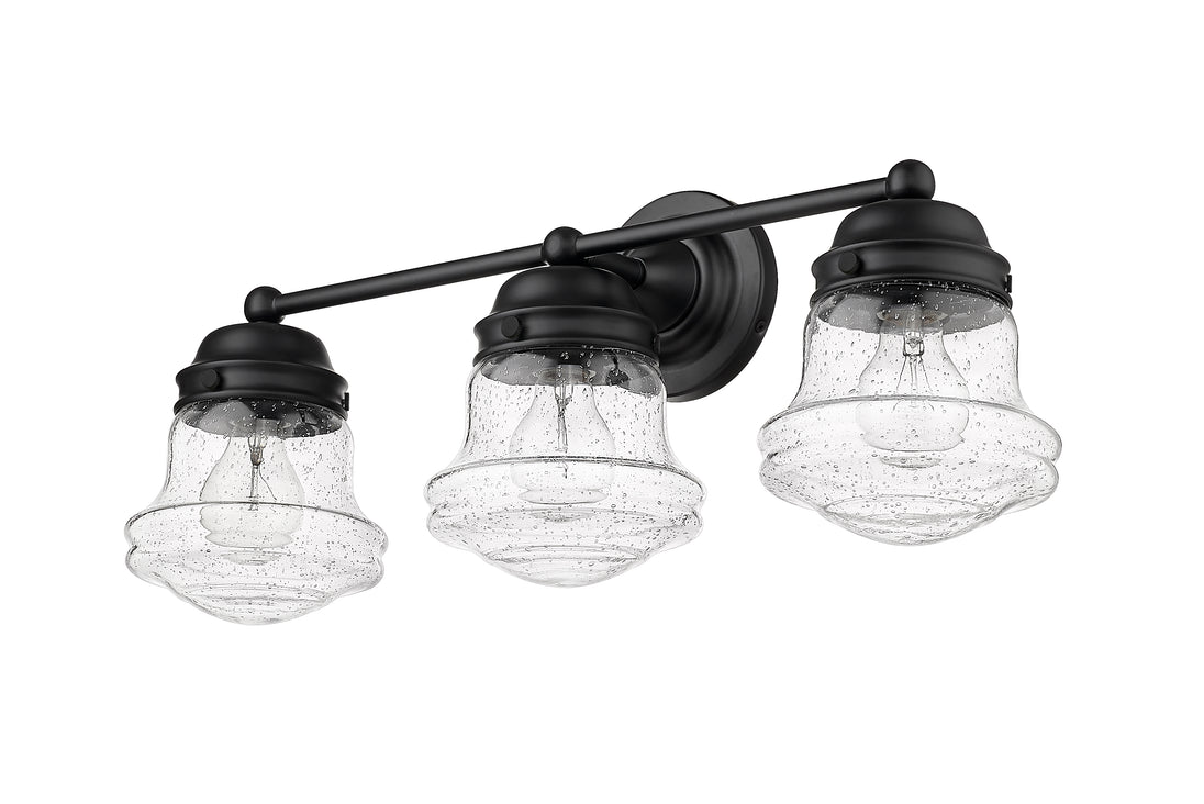 Charming schoolhouse style shades crafted of romantic clear seedy glass tell the story of a nautical industrial theme that lends a ton of style to this three-light vanity light. Perfectly suited for a traditional or transitional bath space, this light from the Vaughn collection contrasts bold matte black finish steel with clear seedy glass, delivering a striking look that is timeless and elegant. This light fixture stands out as a central focus.