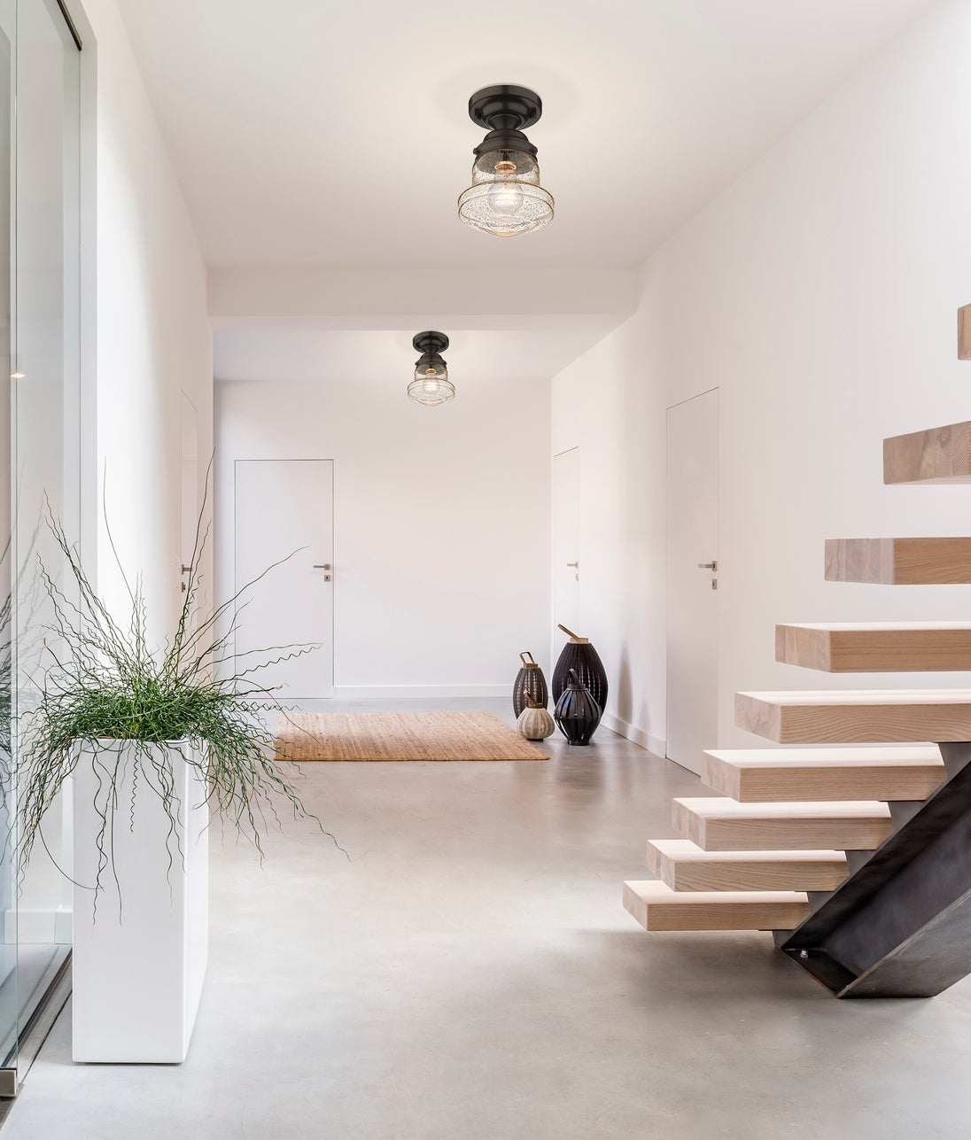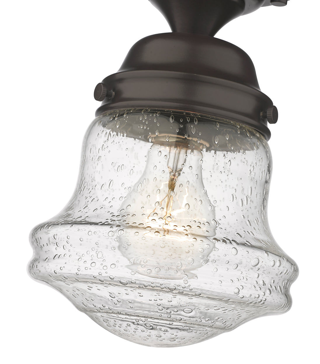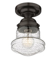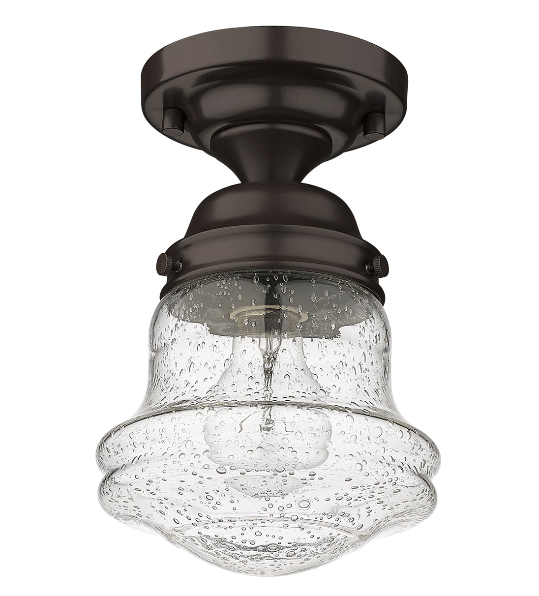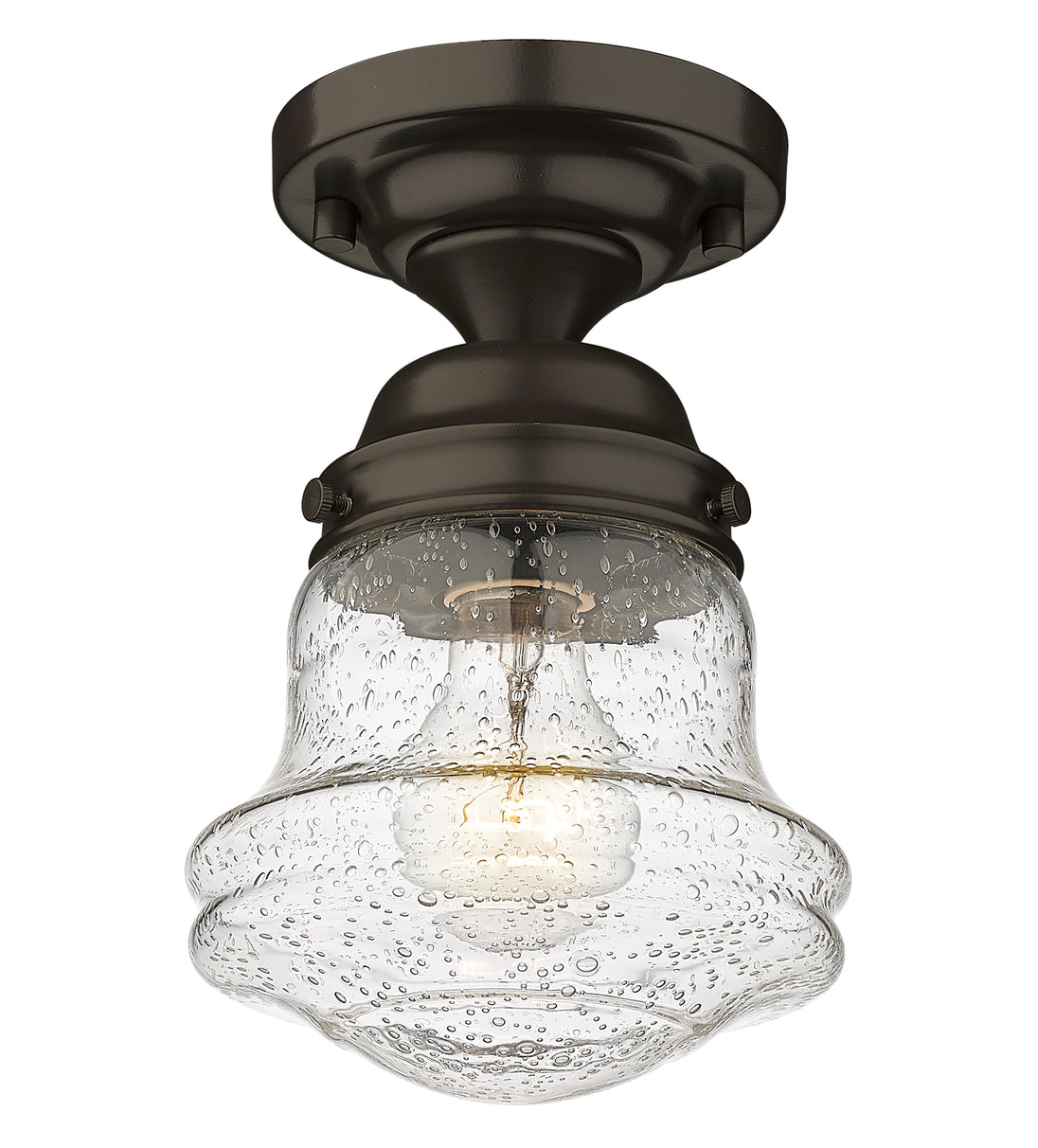 Give your space a modern farmhouse feel or restoration aesthetic with this perfectly sized, petite single light flush mount, designed with a small yet sleek contoured silhouette and a rustic dark bronze finish that creates a subtle metallic element to the space. A perfect addition to a compact apartment foyer or narrow hallway, this Mid-Century Modern-inspired flush mount also offers an artisan quality with a clear seedy glass globe that presents an old-world charm and texture. Mount this small transitional flush mount within a sophisticated yet rustic country setting, elevating the interior with contrasted luxe materials.