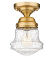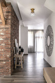 Give your space a modern farmhouse feel or restoration aesthetic with this perfectly sized, petite single light flush mount, designed with a small yet sleek contoured silhouette and a vintage-like heritage brass finish that creates a subtle warm metallic touch to the space. A perfect addition to a compact apartment foyer or narrow hallway, this Mid-Century Modern-inspired flush mount also offers an artisan quality with a clear seedy glass globe that presents an old-world charm and texture. Mount this small transitional flush mount within a sophisticated yet rustic country setting, elevating the interior with contrasted luxe materials.