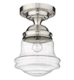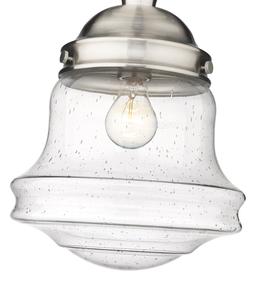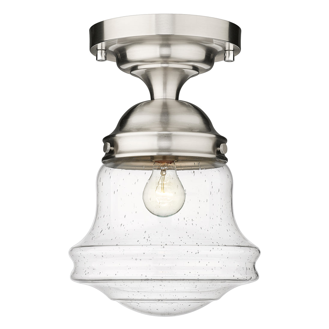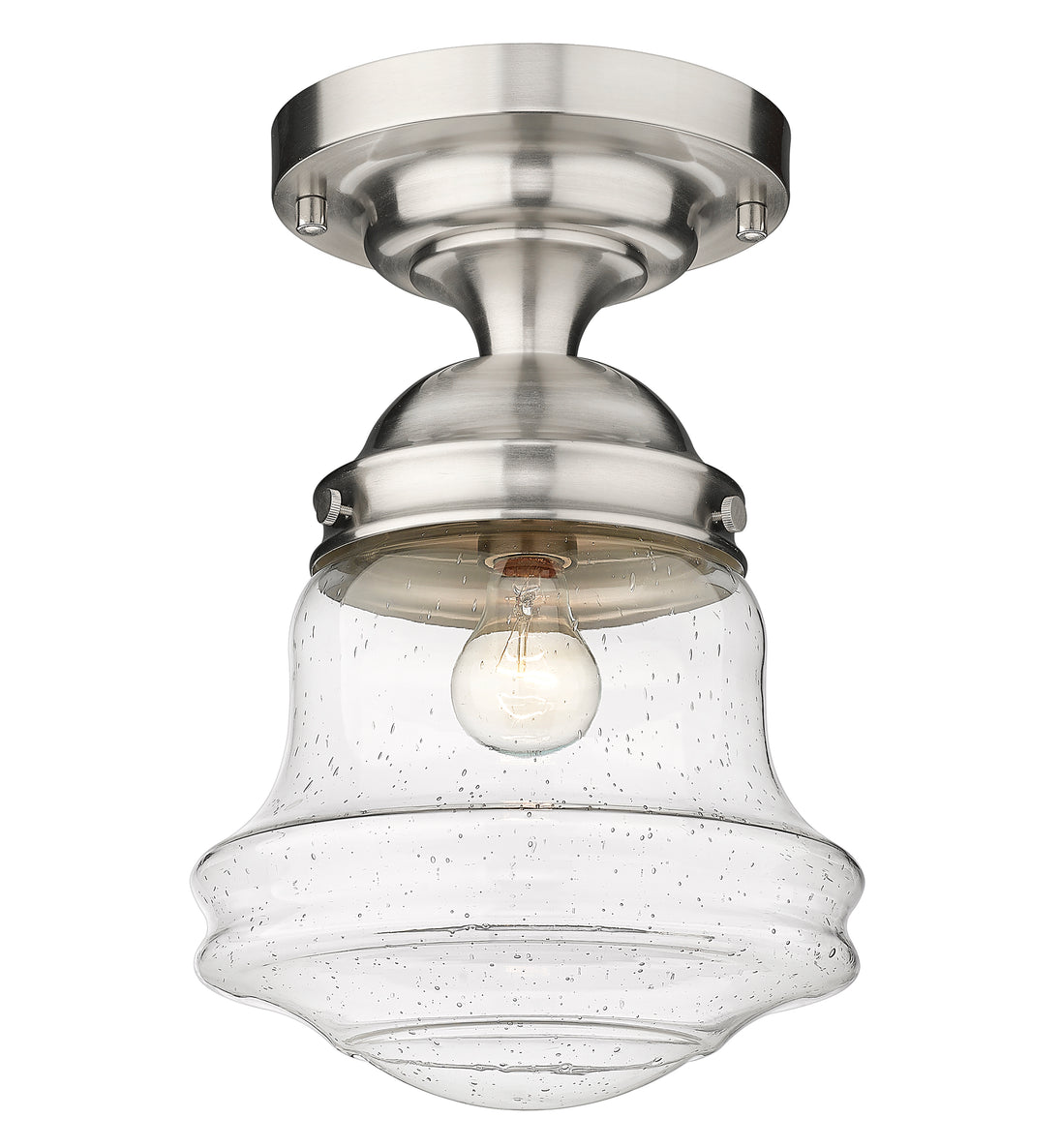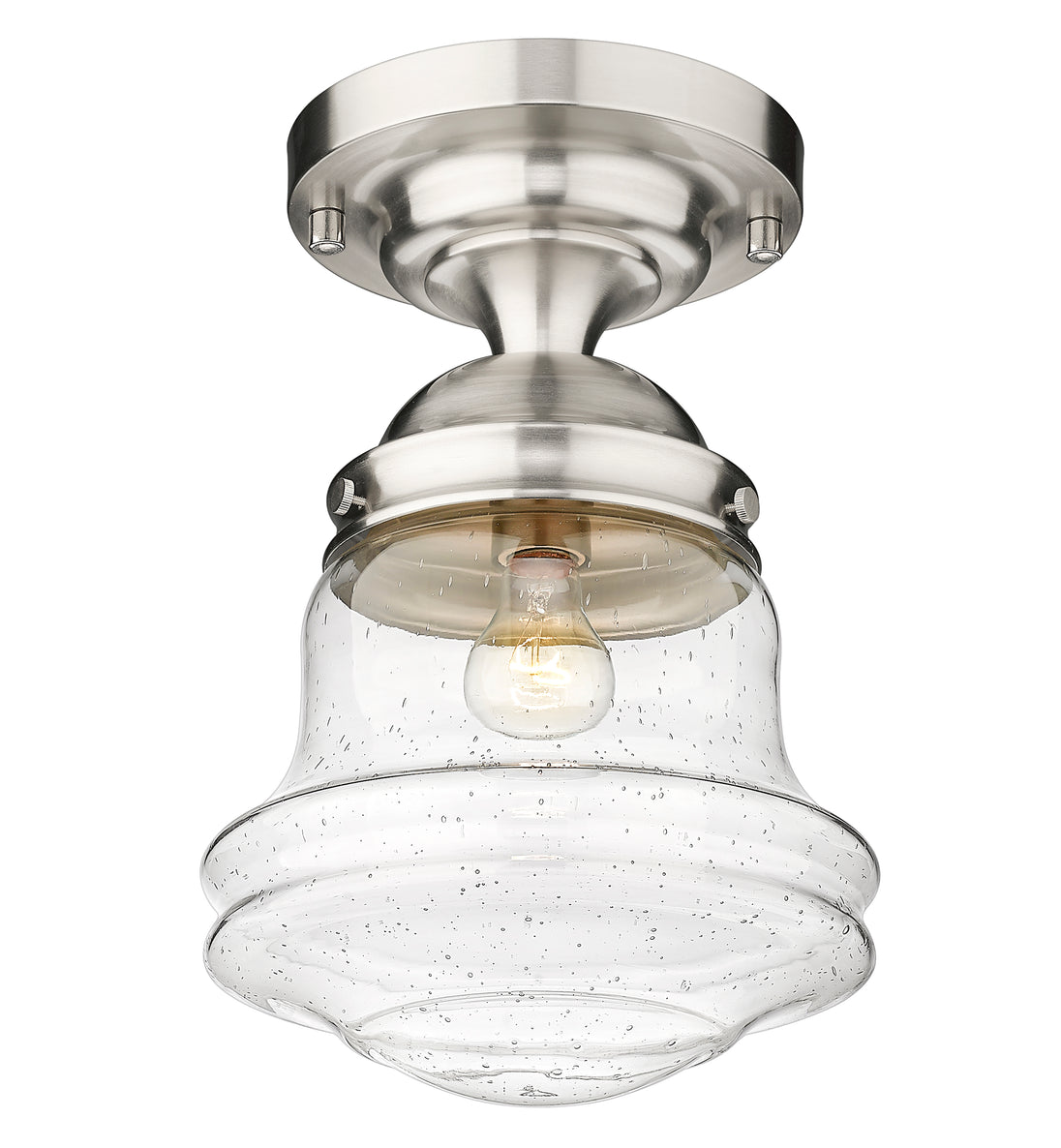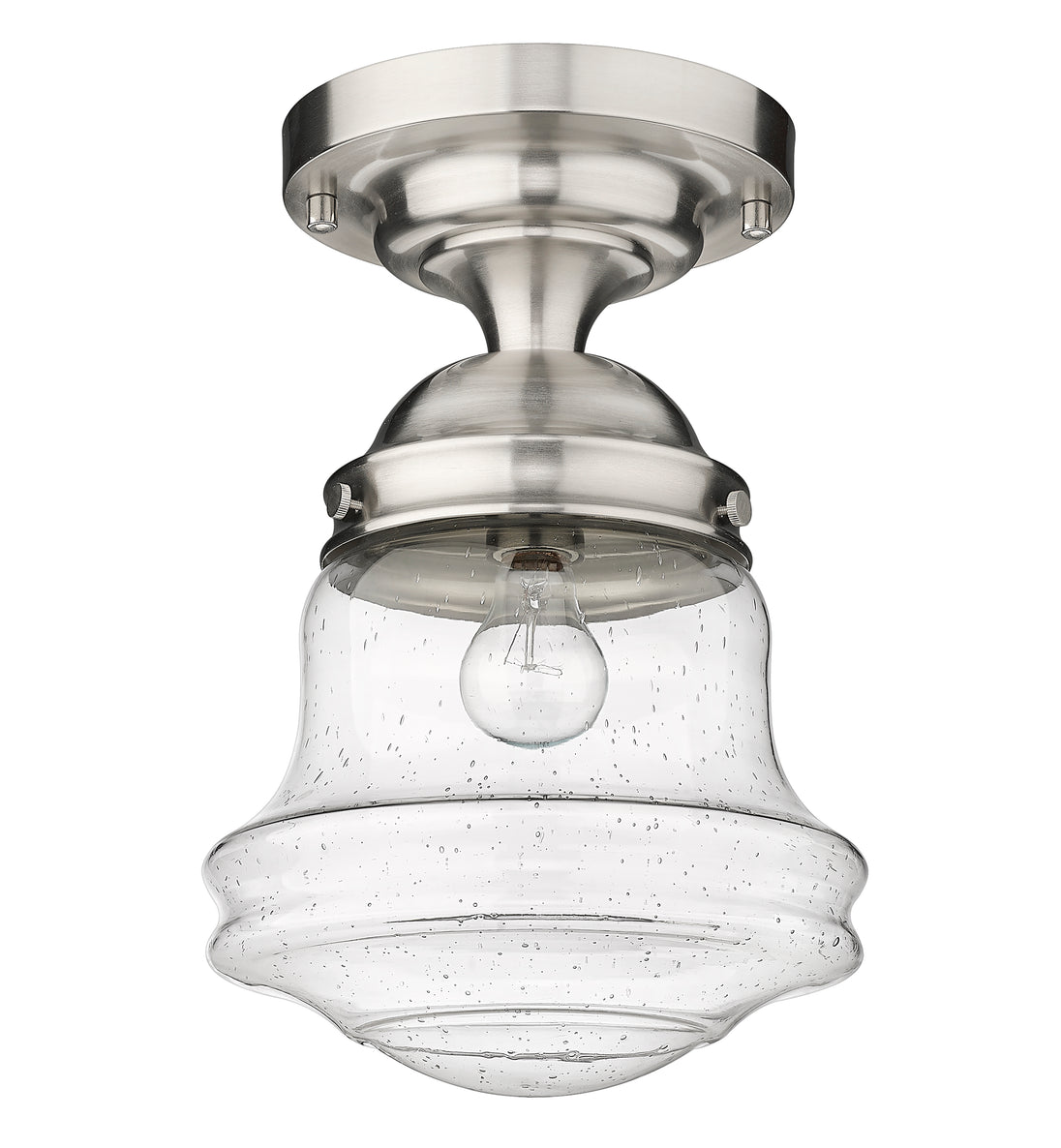 Give your space a modern farmhouse feel or restoration aesthetic with this single light flush mount, designed with a sleek contoured silhouette and a gleaming brushed nickel finish that creates a metallic touch to the space. A perfect addition to a powder room or compact space, this Mid-Century Modern-inspired flush mount also offers an artisan quality with a clear seedy glass globe that presents an old-world charm and texture. Mount this transitional flush mount within a sophisticated yet rustic country setting, elevating the interior with contrasted luxe materials.