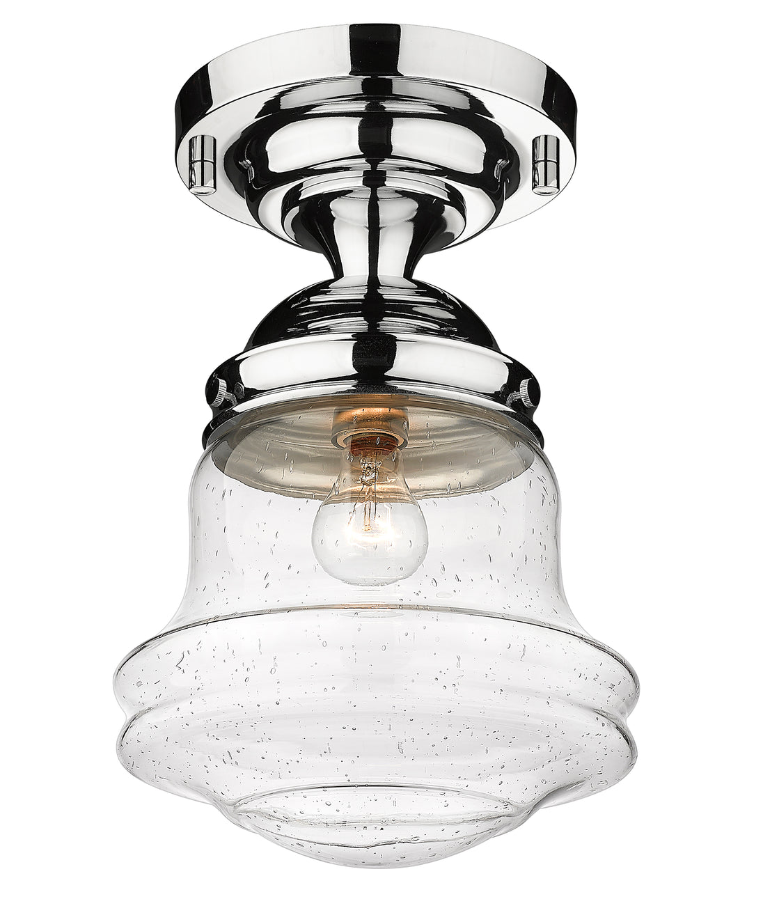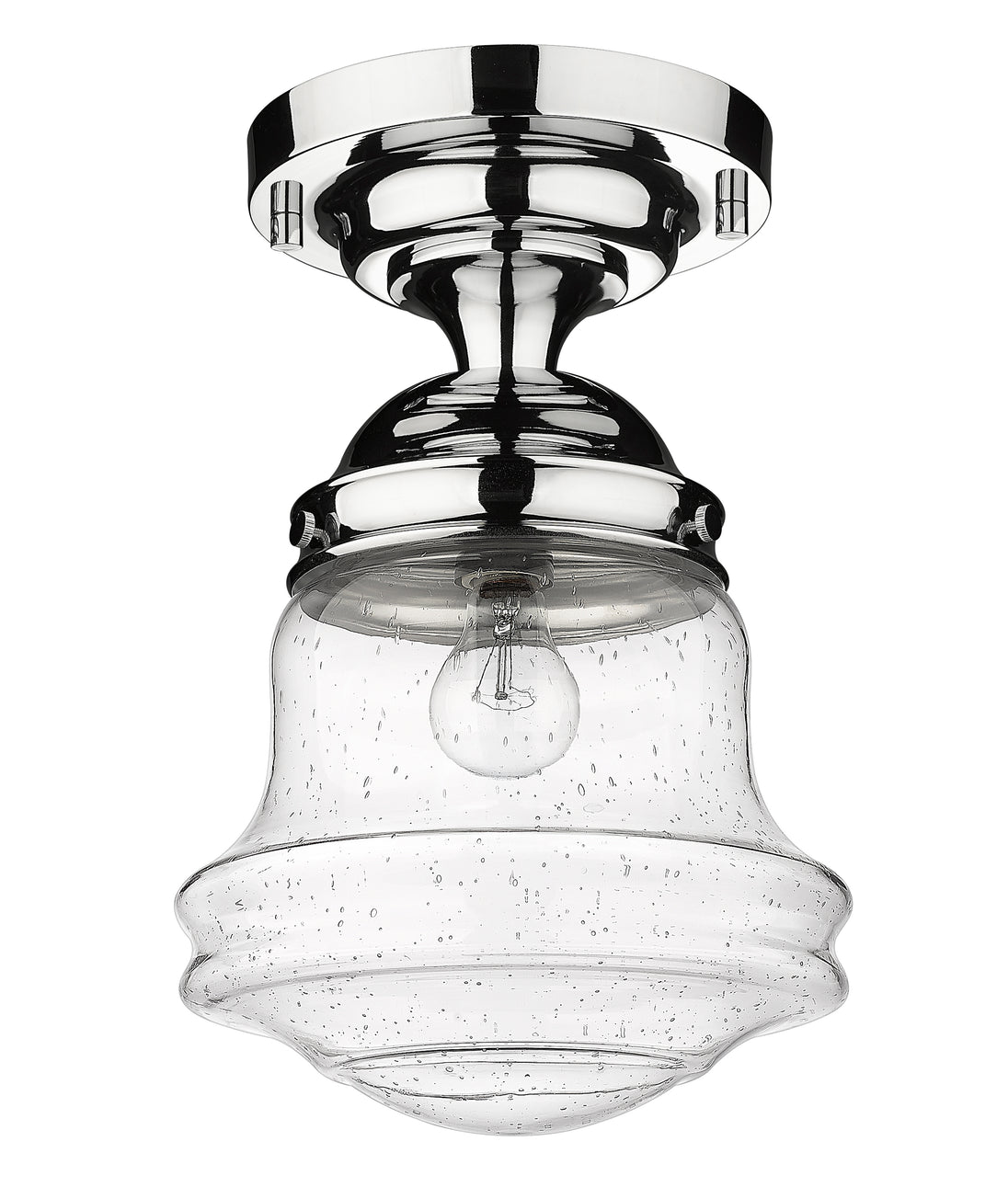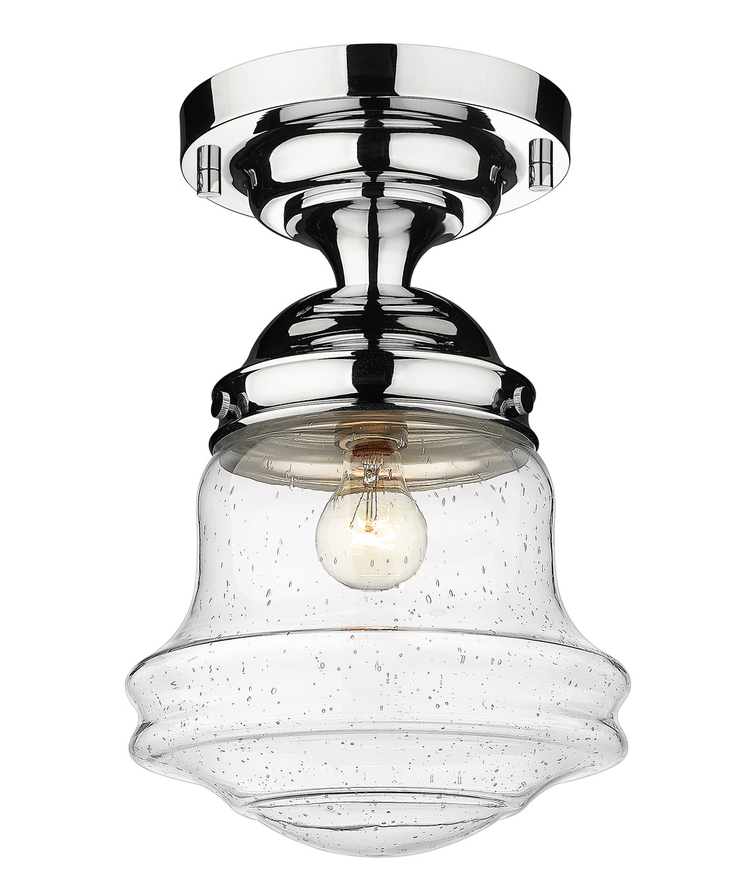 Give your space a modern farmhouse feel or restoration aesthetic with this single light flush mount, designed with a sleek contoured silhouette and a gleaming and polished chrome finish that creates a metallic element to the space. A perfect addition to a powder room or compact space, this Mid-Century Modern-inspired flush mount also offers an artisan quality with a clear seedy glass globe that presents an old-world charm and texture. Mount this transitional flush mount within a sophisticated yet rustic country setting, elevating the interior with contrasted luxe materials.