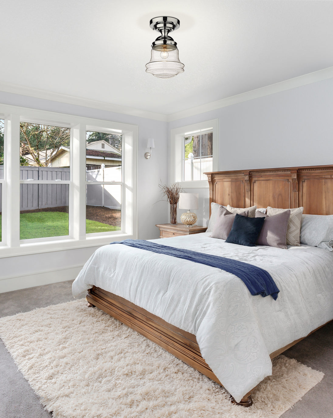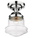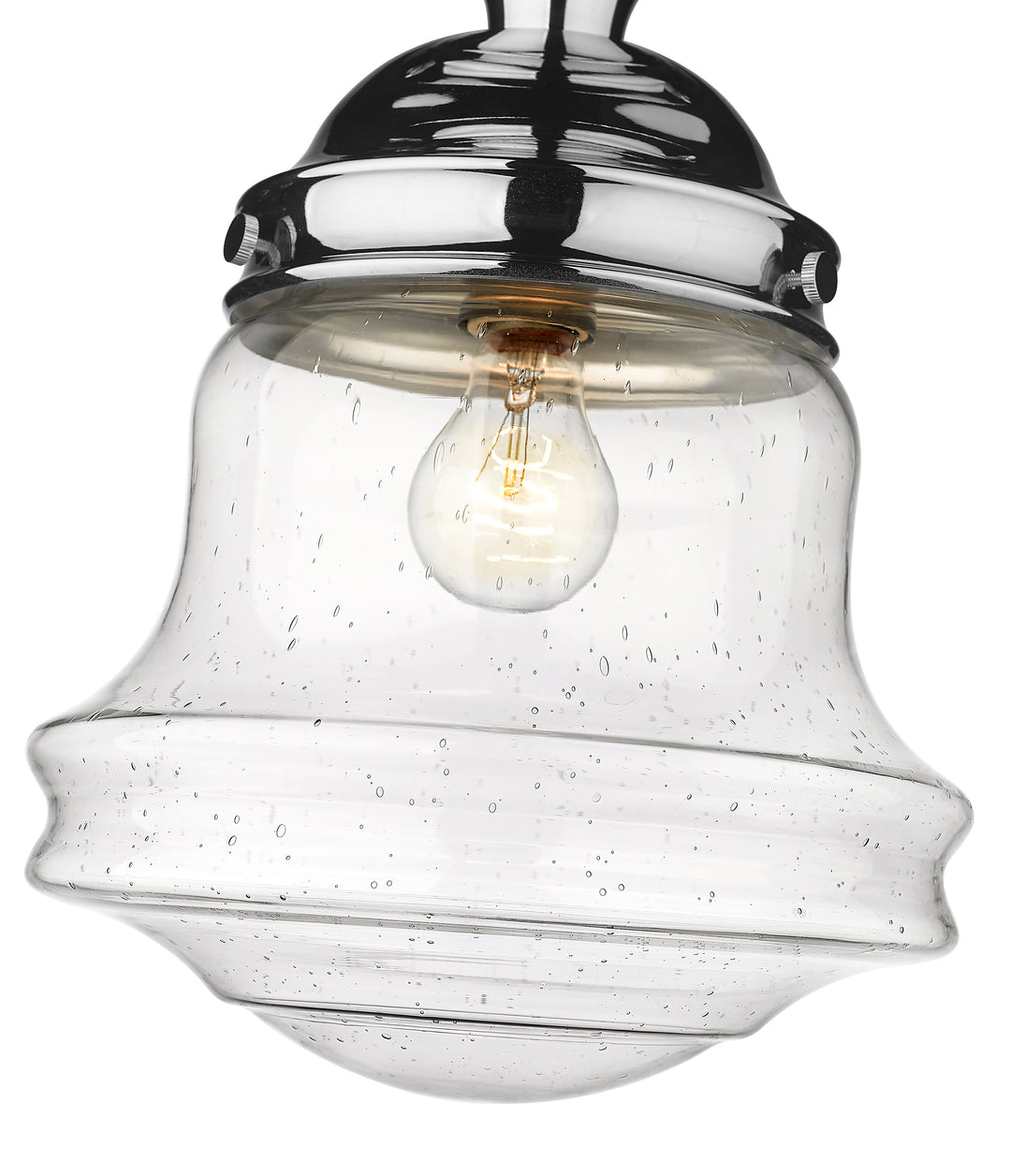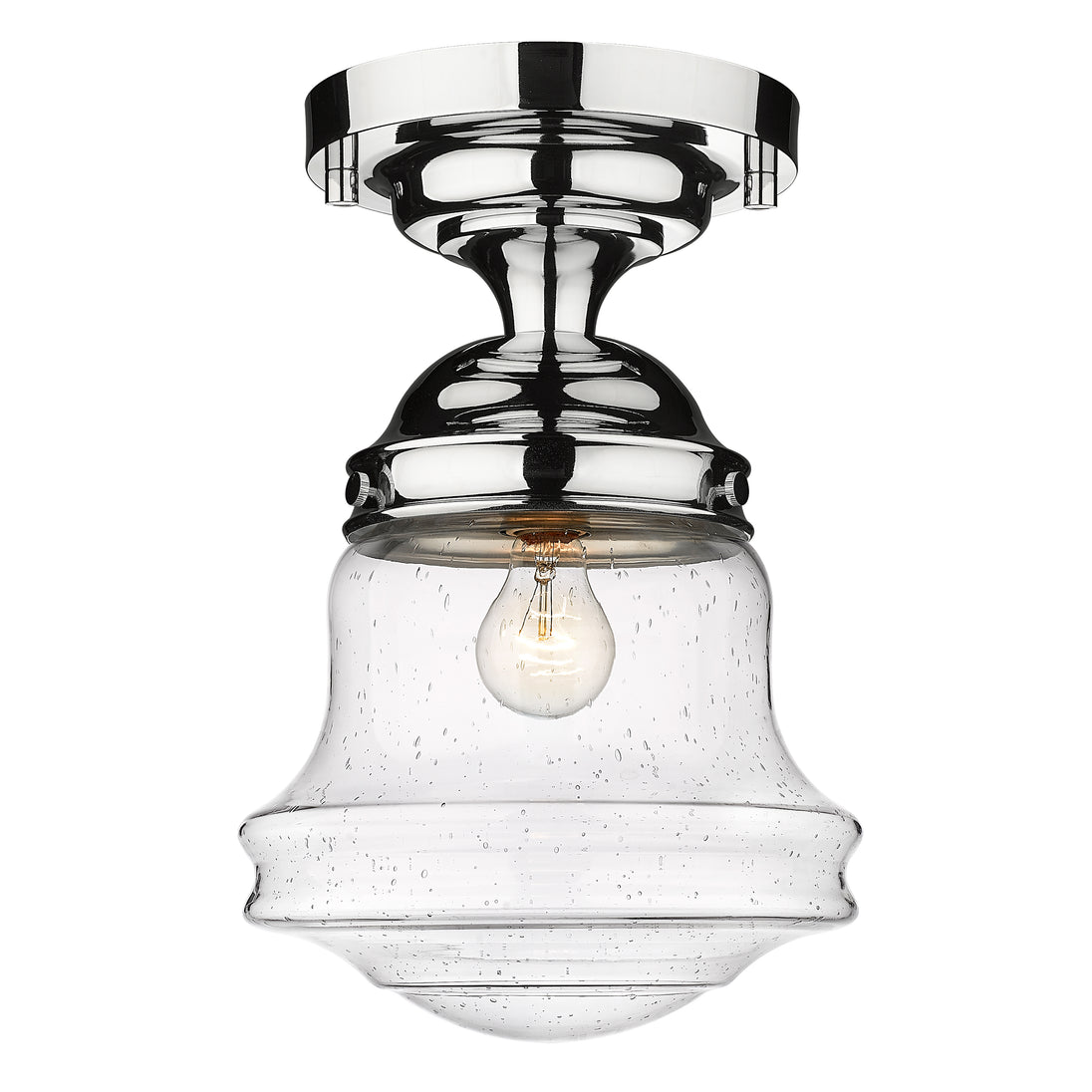 Give your space a modern farmhouse feel or restoration aesthetic with this single light flush mount, designed with a sleek contoured silhouette and a gleaming and polished chrome finish that creates a metallic element to the space. A perfect addition to a powder room or compact space, this Mid-Century Modern-inspired flush mount also offers an artisan quality with a clear seedy glass globe that presents an old-world charm and texture. Mount this transitional flush mount within a sophisticated yet rustic country setting, elevating the interior with contrasted luxe materials.