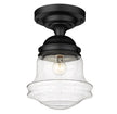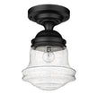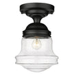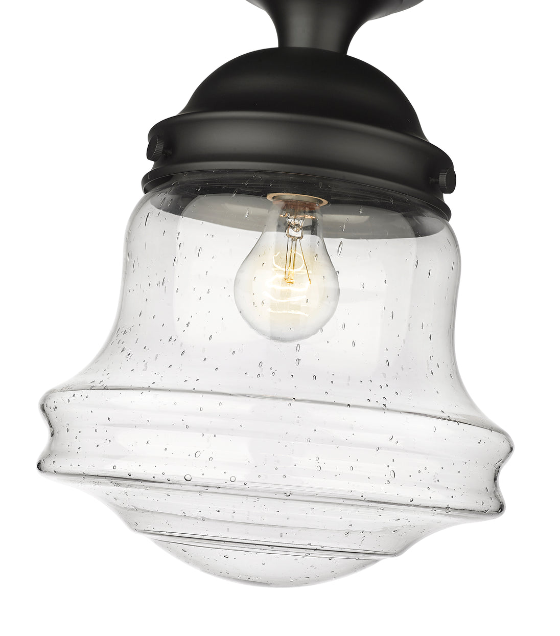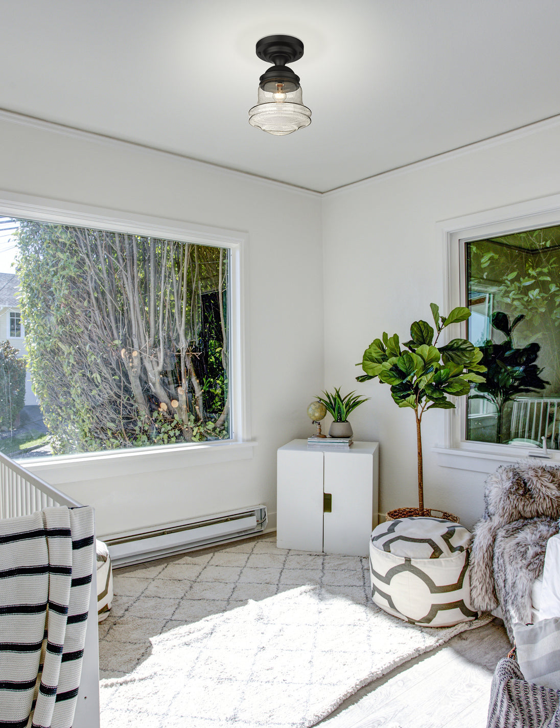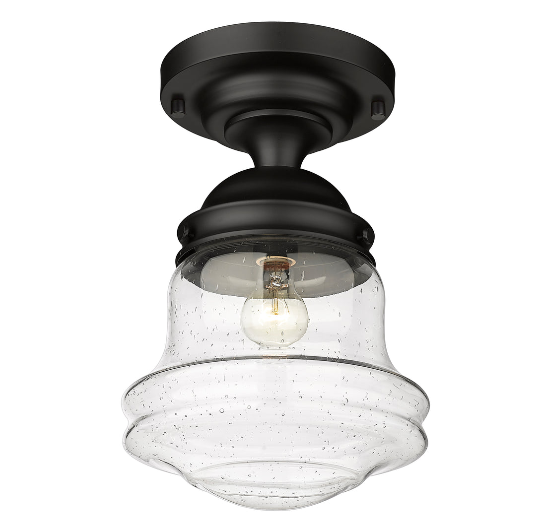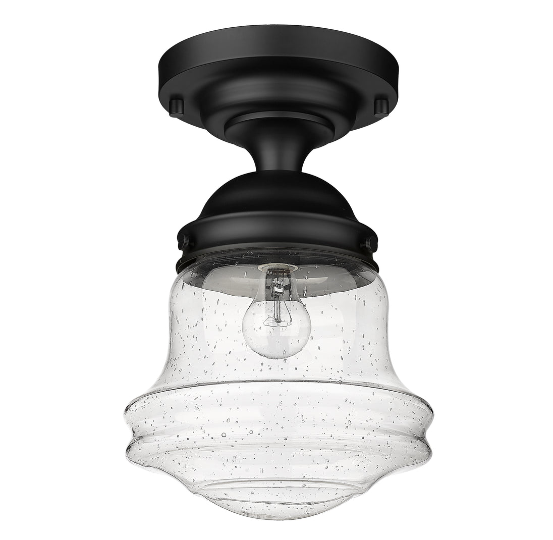 Give your space a modern farmhouse feel or restoration aesthetic with this single light flush mount, designed with a sleek contoured silhouette and a rustic matte black finish that creates a warm metallic touch to the space. A perfect addition to a powder room or compact space, this Mid-Century Modern-inspired flush mount also offers an artisan quality with a clear seedy glass globe that presents an old-world charm and texture. Mount this transitional flush mount within a sophisticated yet rustic country setting, elevating the interior with contrasted luxe materials.